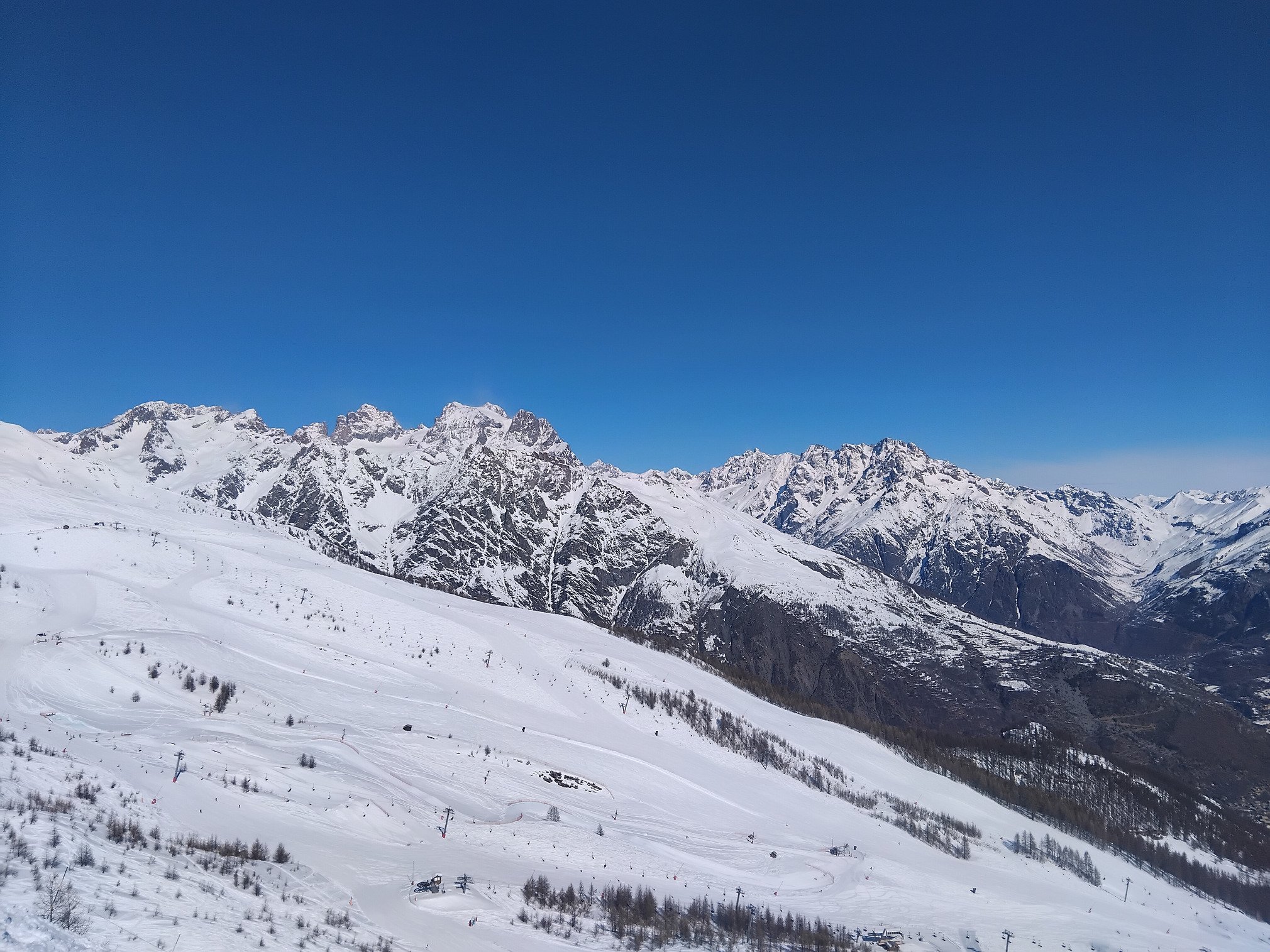 Ce matin, j'ai les jambes qui tirent suite à la grosse journée d'hier. Je décide donc de faire quelques pistes pour m'echauffer, parfaitement damées comme d'habitude, puis je fais quelques montées skis sur l'épaule au rocher noir pour skier le peu de neige pas tracée qu'il reste sur le domaine.