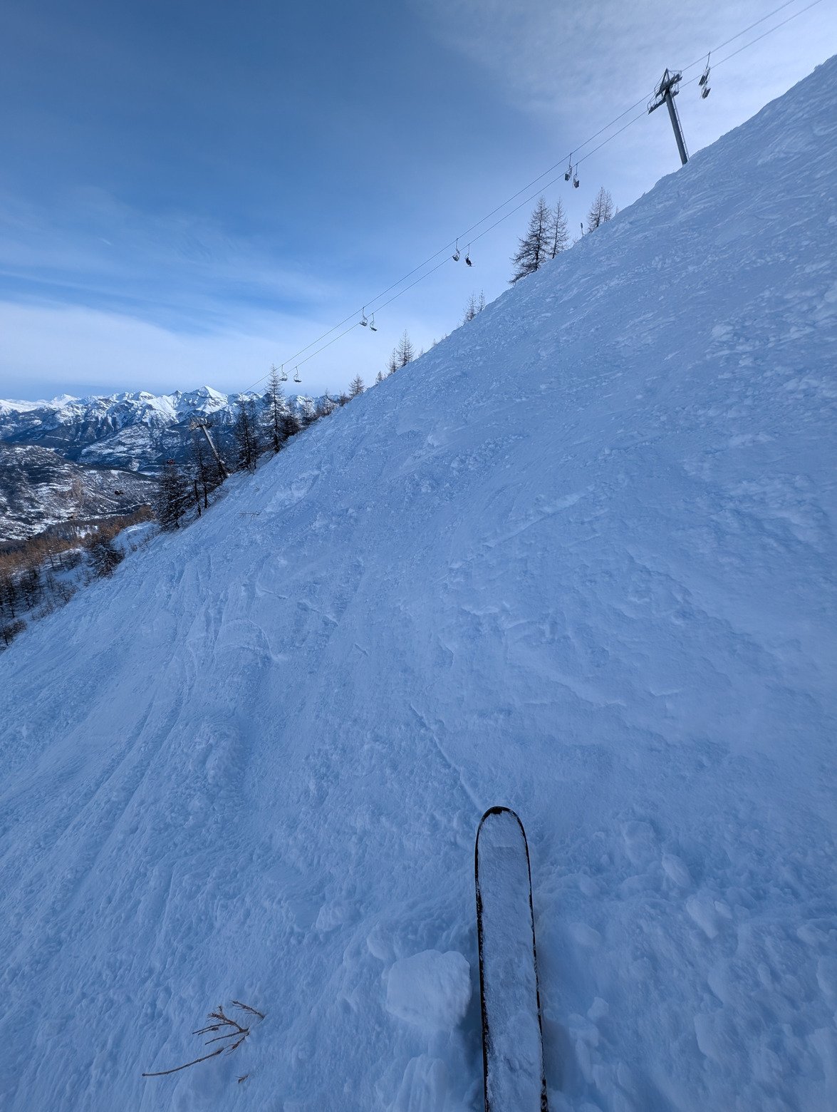 Et ça pour y avoir de la bonne neige il y en a. Les pistes sont impeccables. La fréquentation est très raisonnable : on peut allonger les courbes sur pistes et se faire bien plaisir. Et Lauze a rouvert.