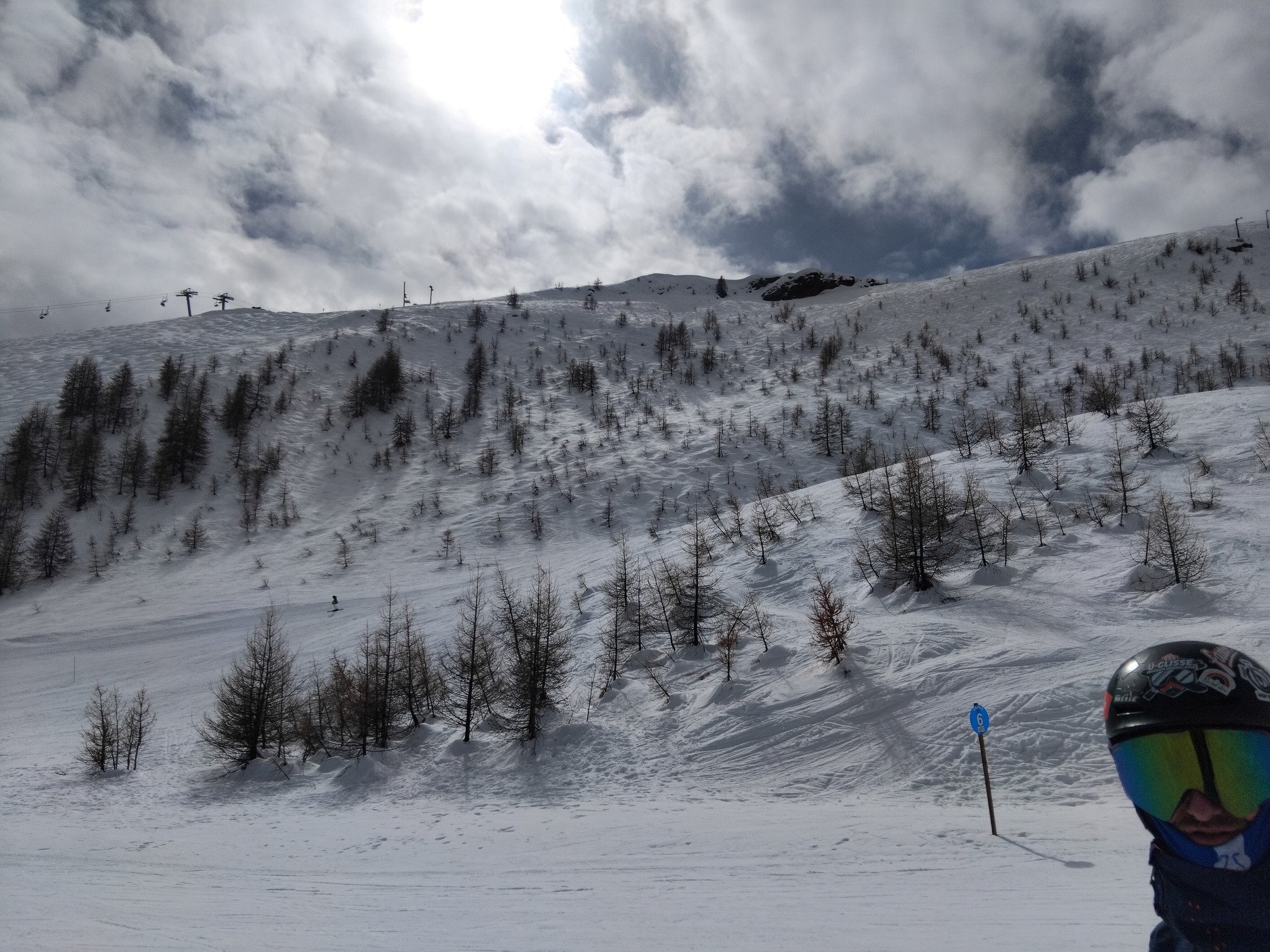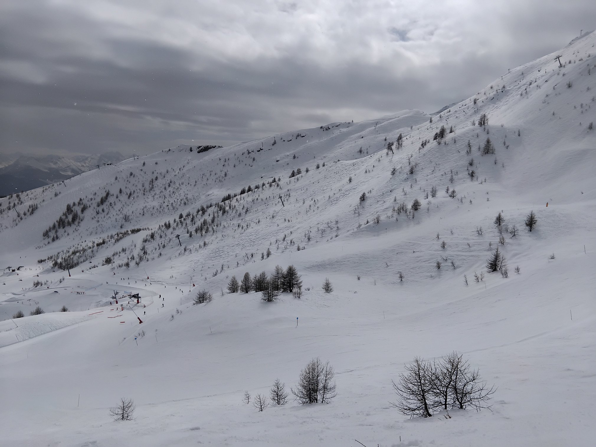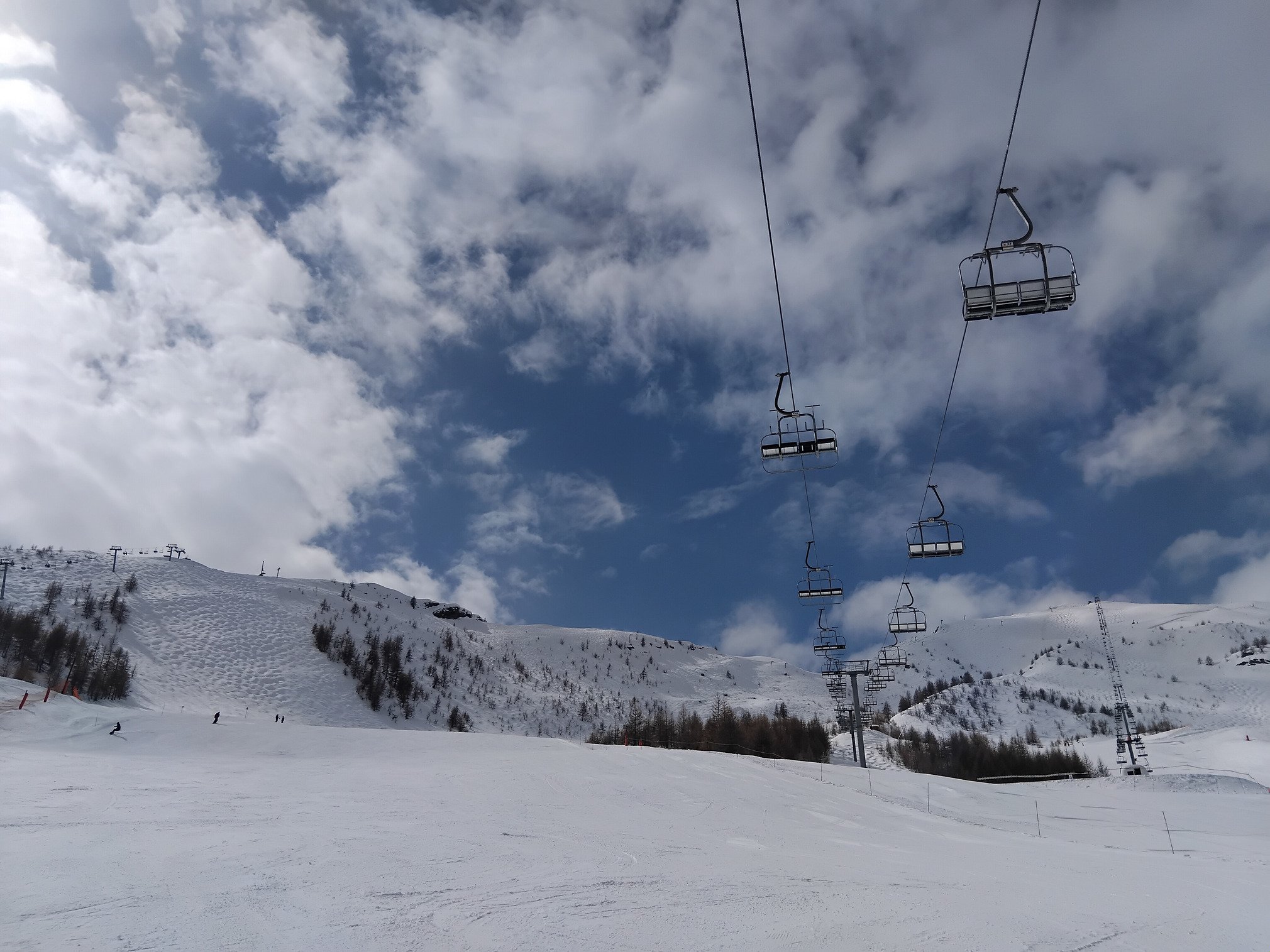 Tout le domaine est ouvert et enneigé, meme si le bas commence à sentir la fonte. Les vacances étants finies, le TS des bruyères à refermé, mais il n'y a personne aux queues des remontées, donc les transitions se font bien.
