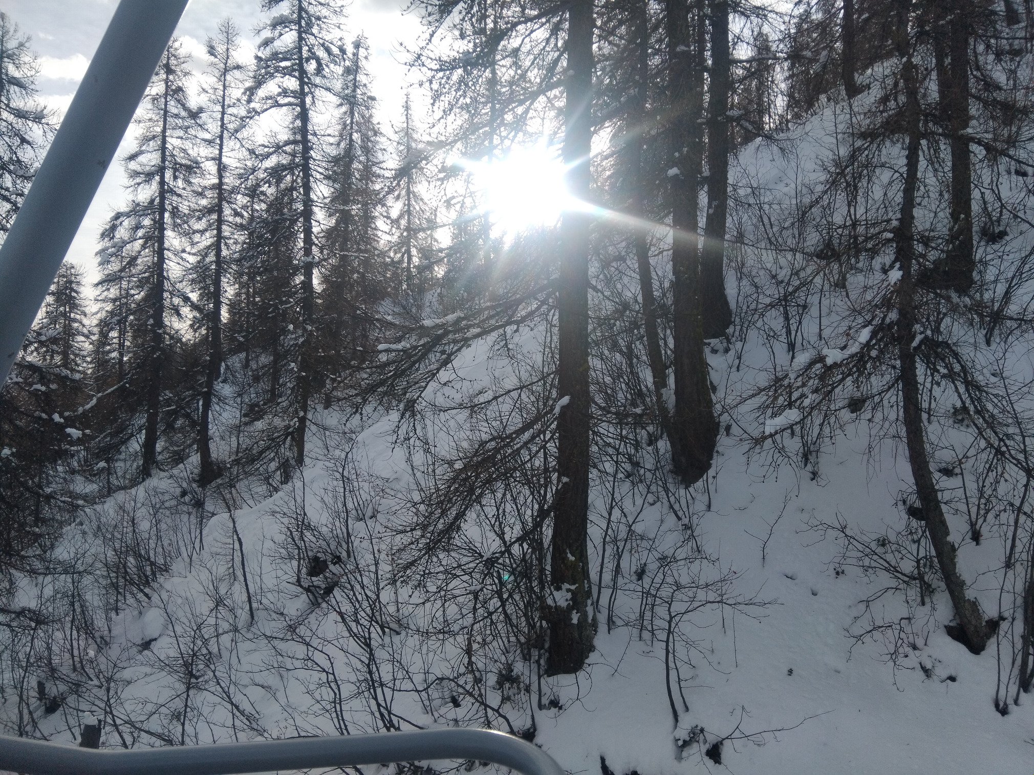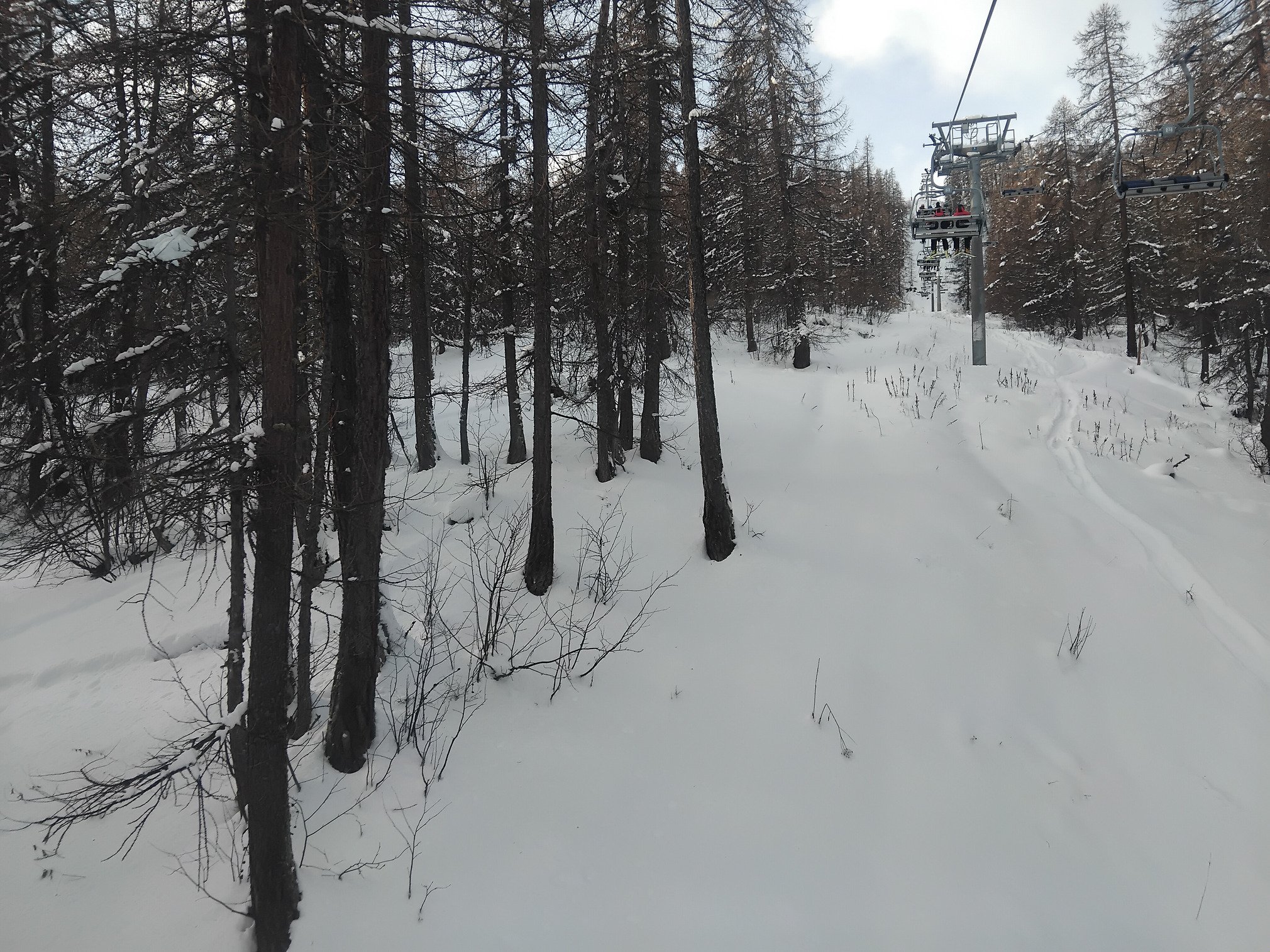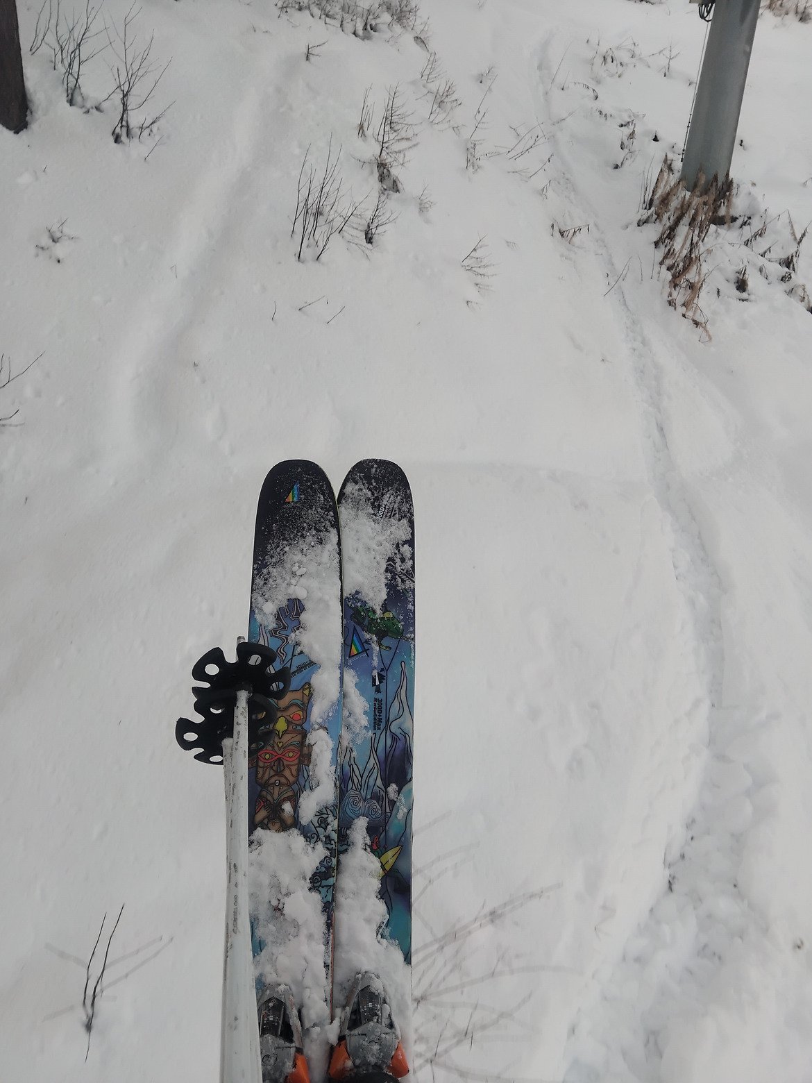 Je tricotte mes lignes habituelles dans la forêt, quelques descentes en neige profonde, environ 60cm, puis je promène un peu sur la partie ouverte du domaine, avant de changer de skis pour l'après midi et dégommer de la trafolle.