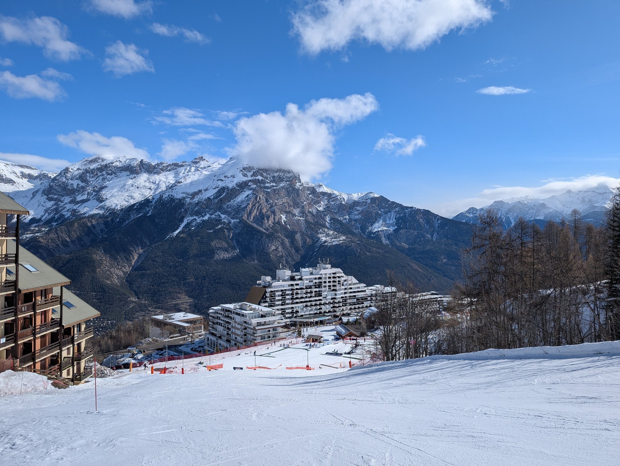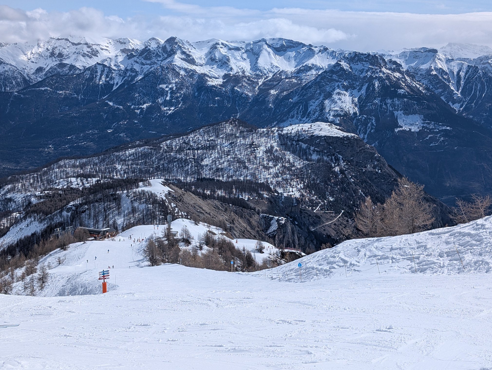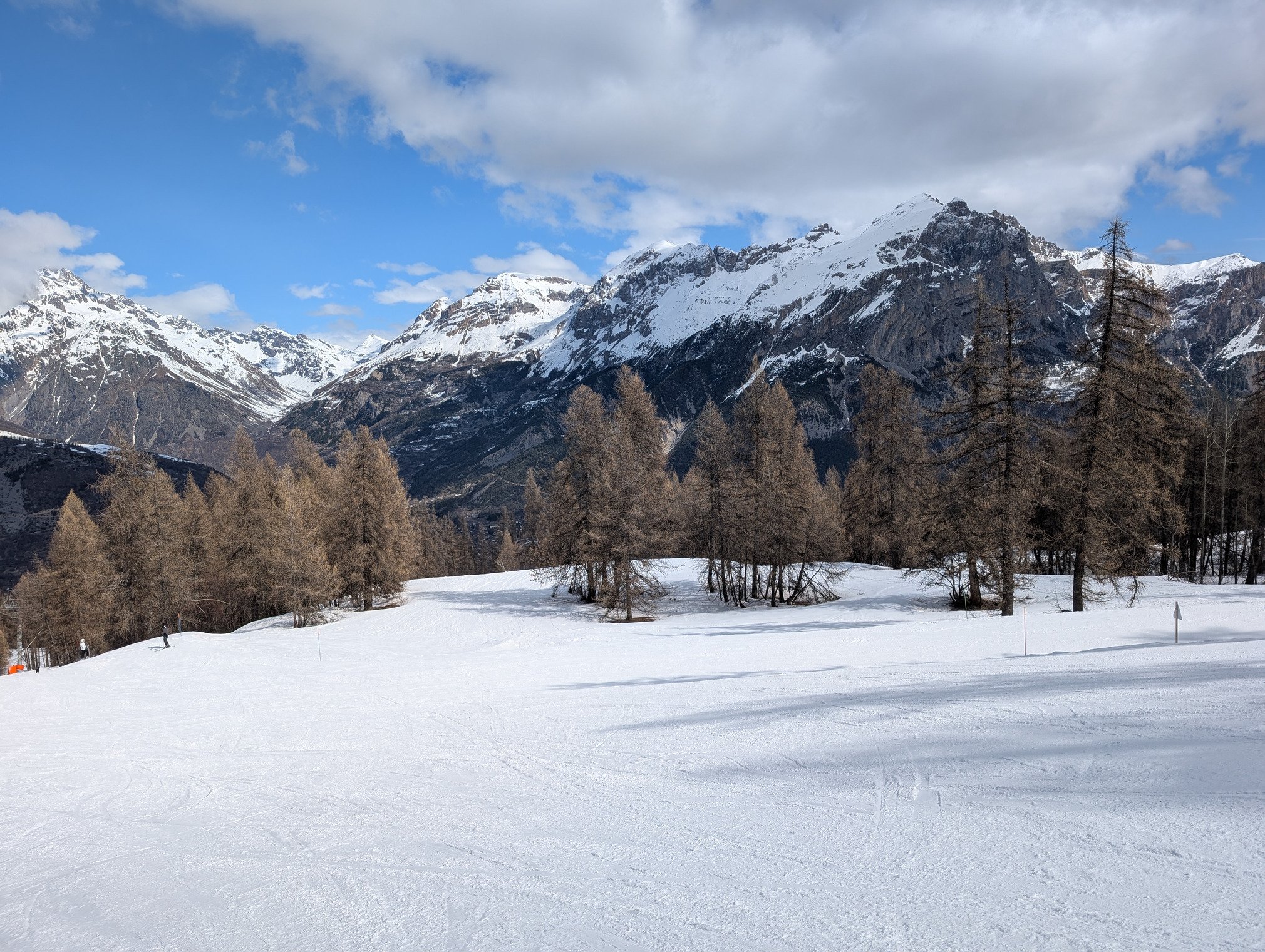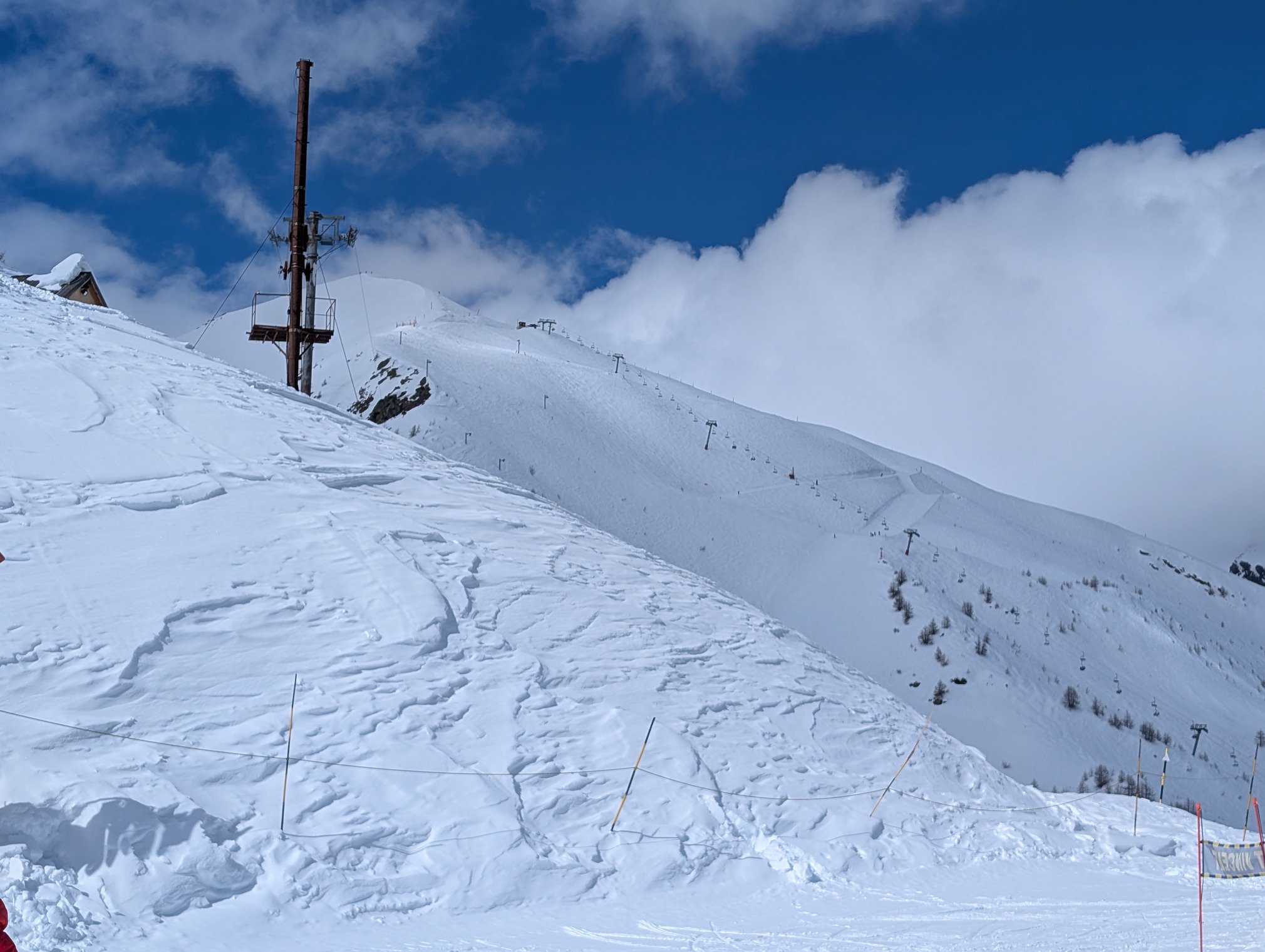 Pour ma dernière, blessure au genou oblige, pas de folies. De la ballade sur pistes, tranquille. Ça tombe bien les conditions sont idéales. Le saupoudrage et le froid relatif donnent une neige fraîche digne de février et ce jusqu'à 1600m et jusqu'à midi. Personne. Pas de risques de collision, de la place. Des paysages magnifiques. Partout les pistes sont impeccablement préparées. je fais le tour de Lauze, du puy et Rocher noir. Avec une pause pour regarder le relais du championnat du monde. Ça monte presque plus vite que ça descend, et les manips de ski c'est lucky luck.