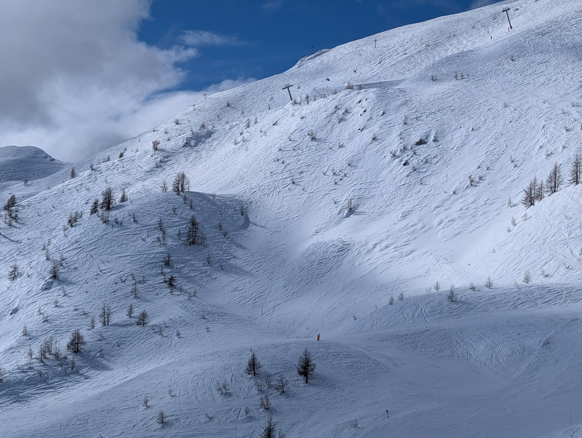 De visu le hors piste a l'air assez chahuté par le vent, mais les noires de Pendine sont en condition optimal. Peu marqué, complètement remplies et offrant un max d'espace neige douce et personne.