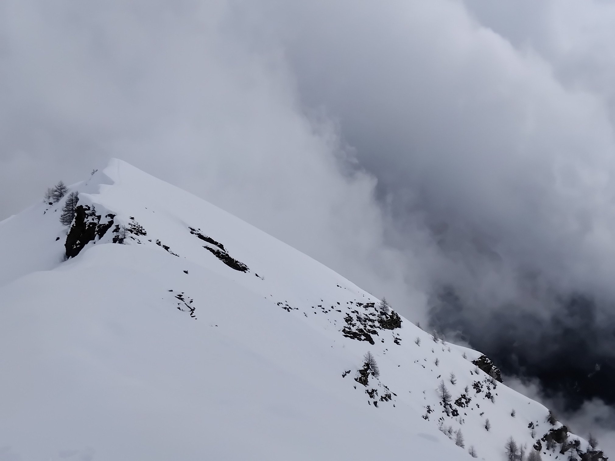 Test de matos de freeride aujourd'hui, la journée se déroule avec une météo qui se dégage un peu malgré des nuages de haute altitude.