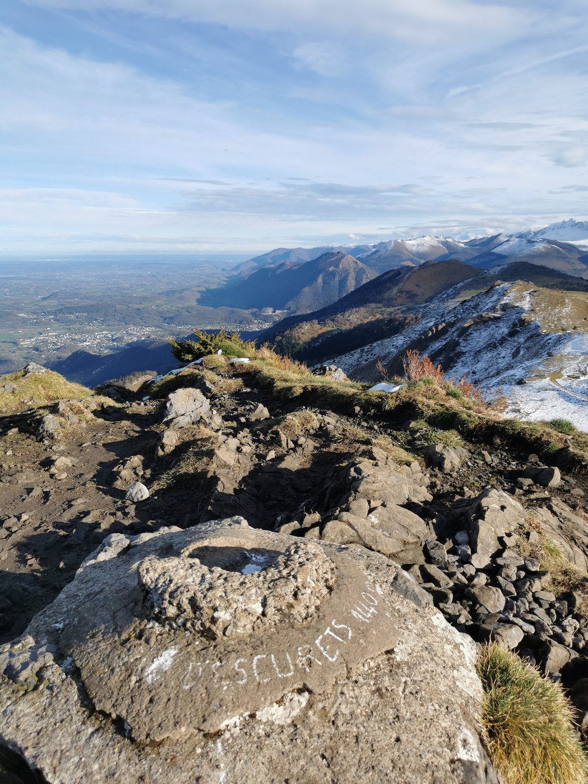 Il ne reste que très peu neige sur les pentes à l'ombre mais le splendide panorama à 360 degrés qu'offre ce petit pic, au dessus du col de Marie Blanque, rattrape le fait que nous ayons emmené les luges pour rien...
