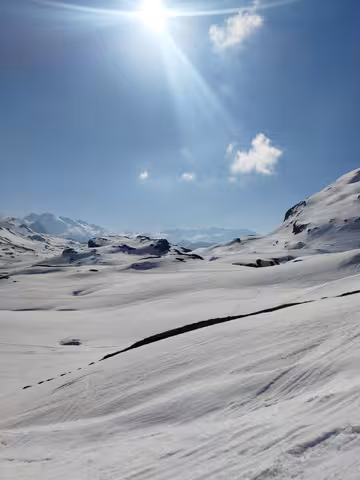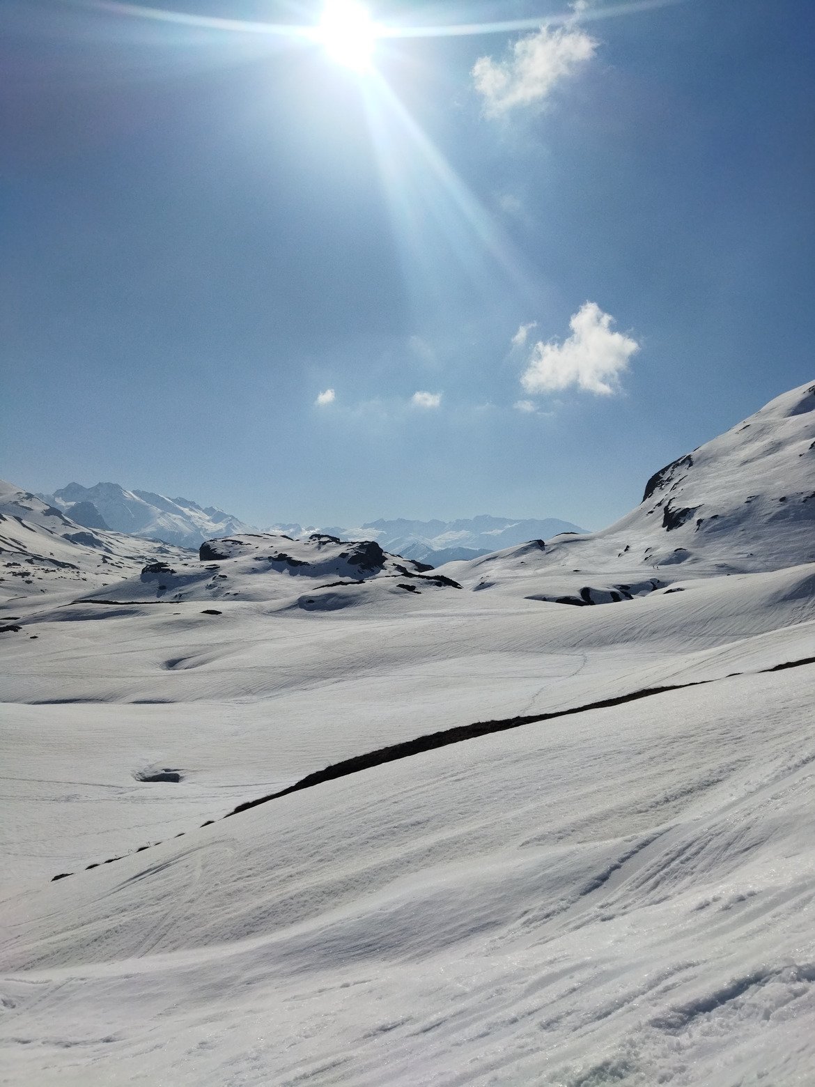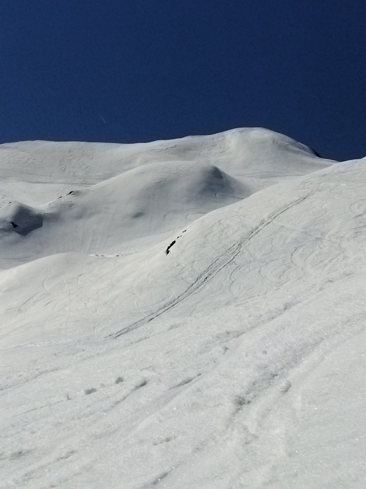 Le vent est de plus en plus présent et glacial, faut pas trop trainer. Descente avec deux skieurs qui m'ont rejoint entre temps, le stratagème est de trouver des petits combes et bosses plein Sud à l'abri du vent.