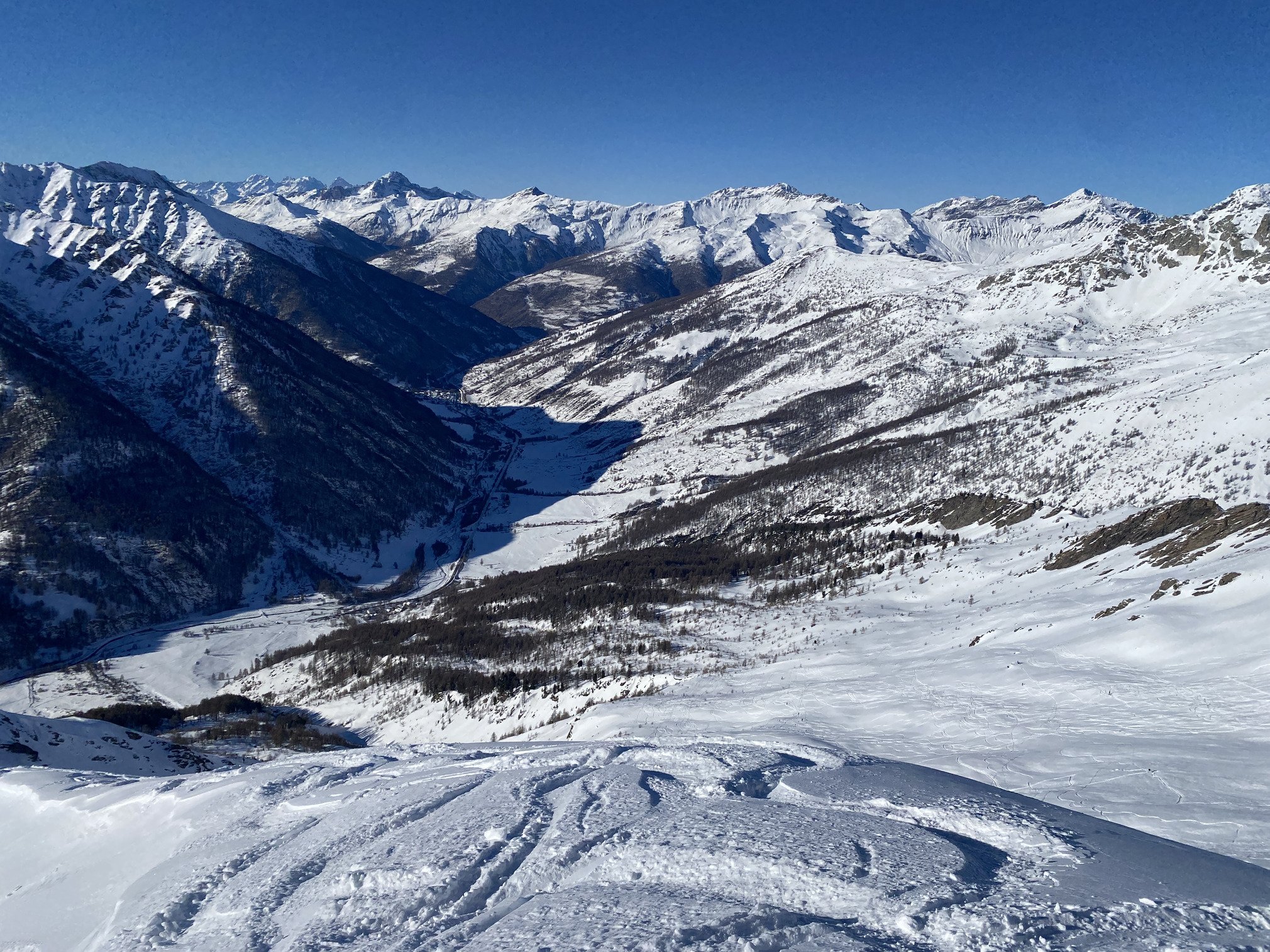 Aujourd'hui, pioche du côté d'Abriès, direction le Praroussin, si en bas il n'y a pas bien plus que 30cm d'epaisseur, en haut c'est beaucoup plus interessant, la neige est restée froide, on se fera trois descentes de la partie superieur pour exorciser le carrelage de belledonne, et meme le melezin du bas que l'on imaginait peu agreable se révélera très bon.