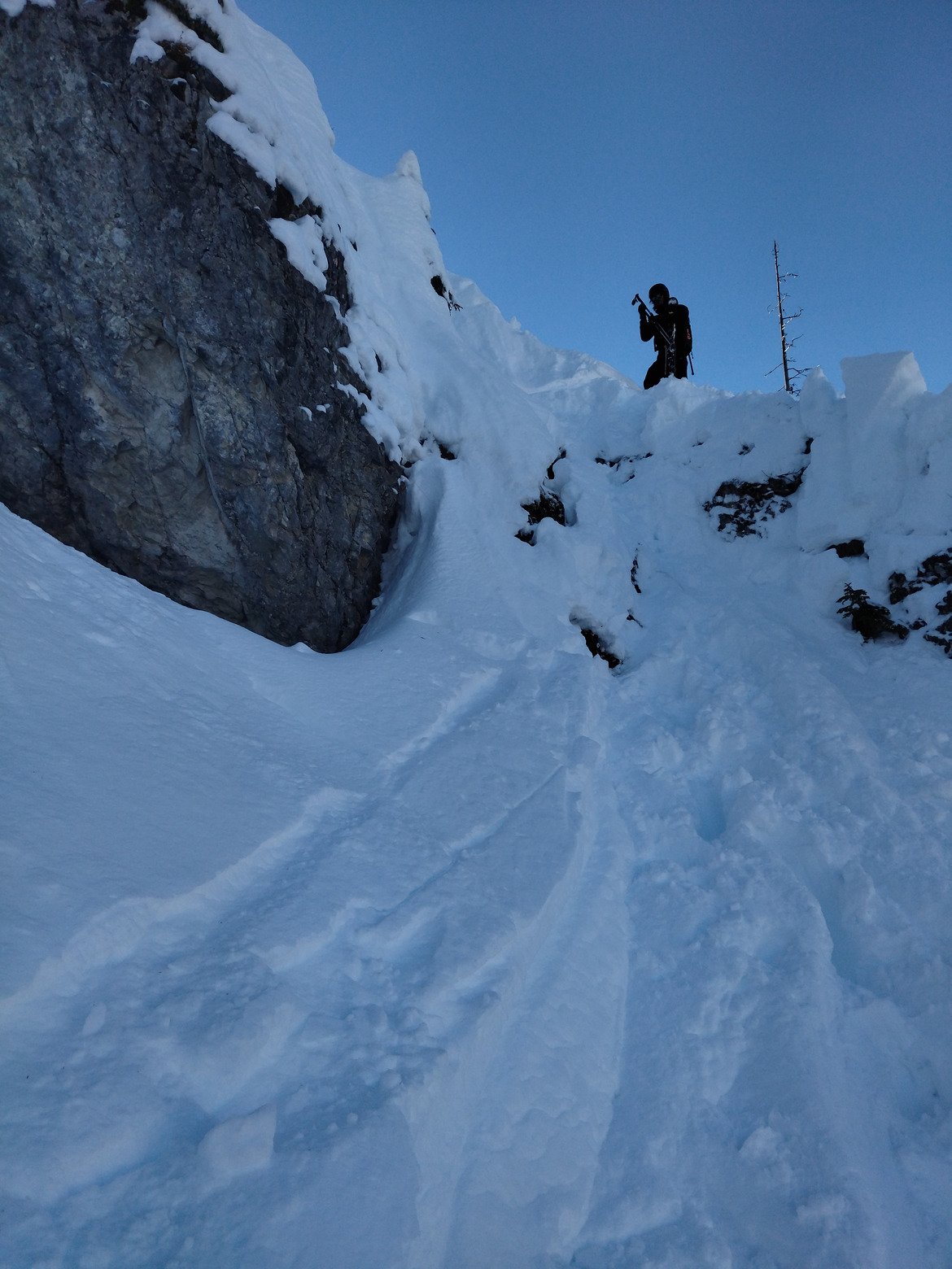On décide finalement très vite de plonger dans la face du jour, plein Est. Les remontées ne sont pas encore en service de ce côté là, on ouvre donc la pente en condition parfaite. Il doit y avoir au moins 80cm, impossible de toucher le fond, c'est l'extase.