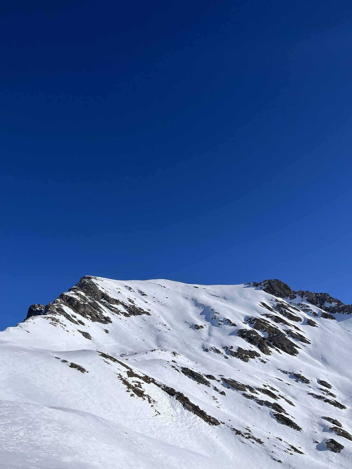 Descente par le même itinéraire qu’à la montée. Pas beaucoup de neige mais ça skie. C’est un peu pentu, rien de dangereux.