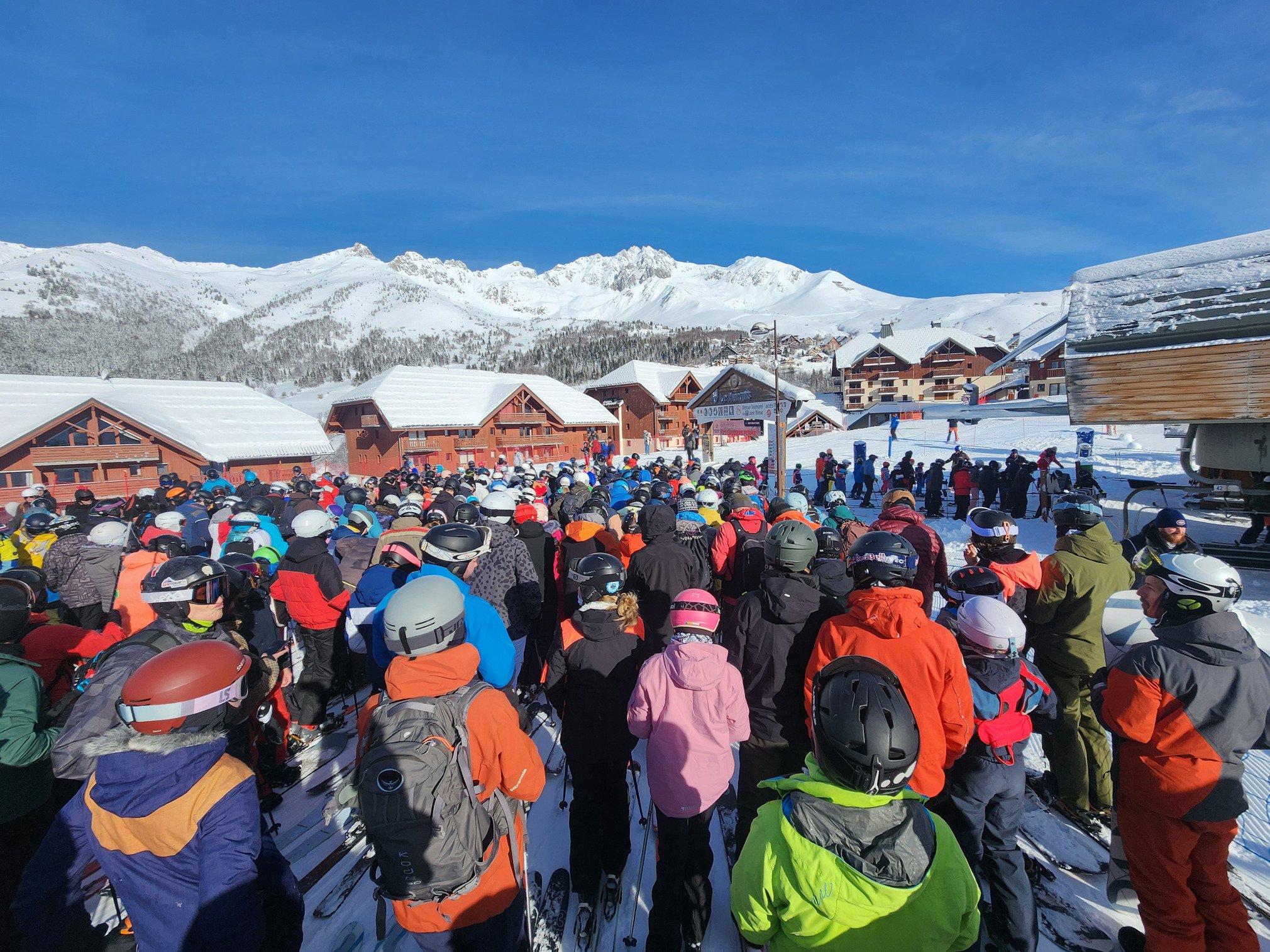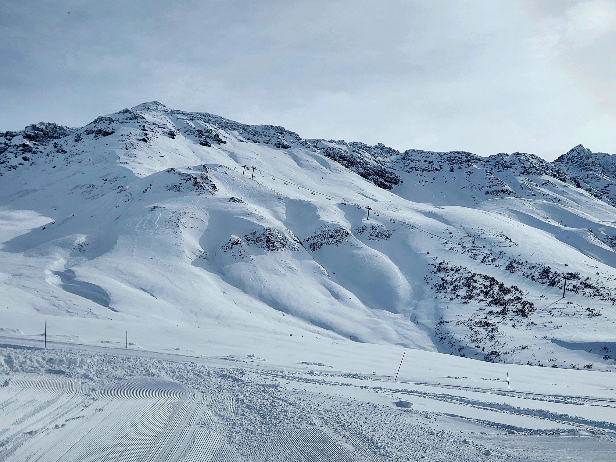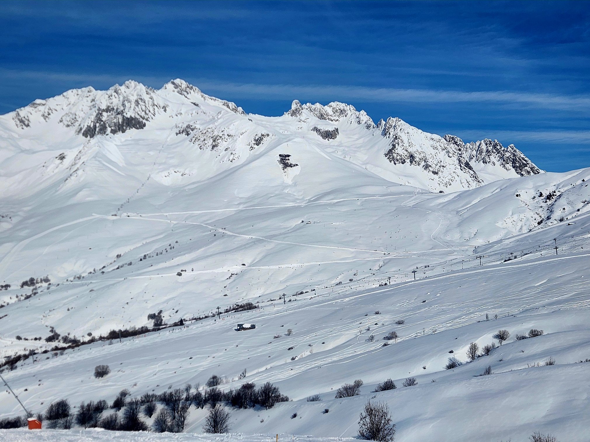 Ouverture du bal à 9H15, jusqu'à 11 h, seuls les 3 TS du bas de la station tournaient; une belle affluence mais le temps d'attente ne dépassait pas les 7 mn donc honorable. Le vent a fait des dégâts bien évidemment et les 70 à 80 cm tombés hier ont été bien déplacés. Ainsi, la qualité de neige variait selon les zones de poudreuse à compactée soufflait. Cela dit la ligne dans l'axe du TS Marquis était bien bonne.