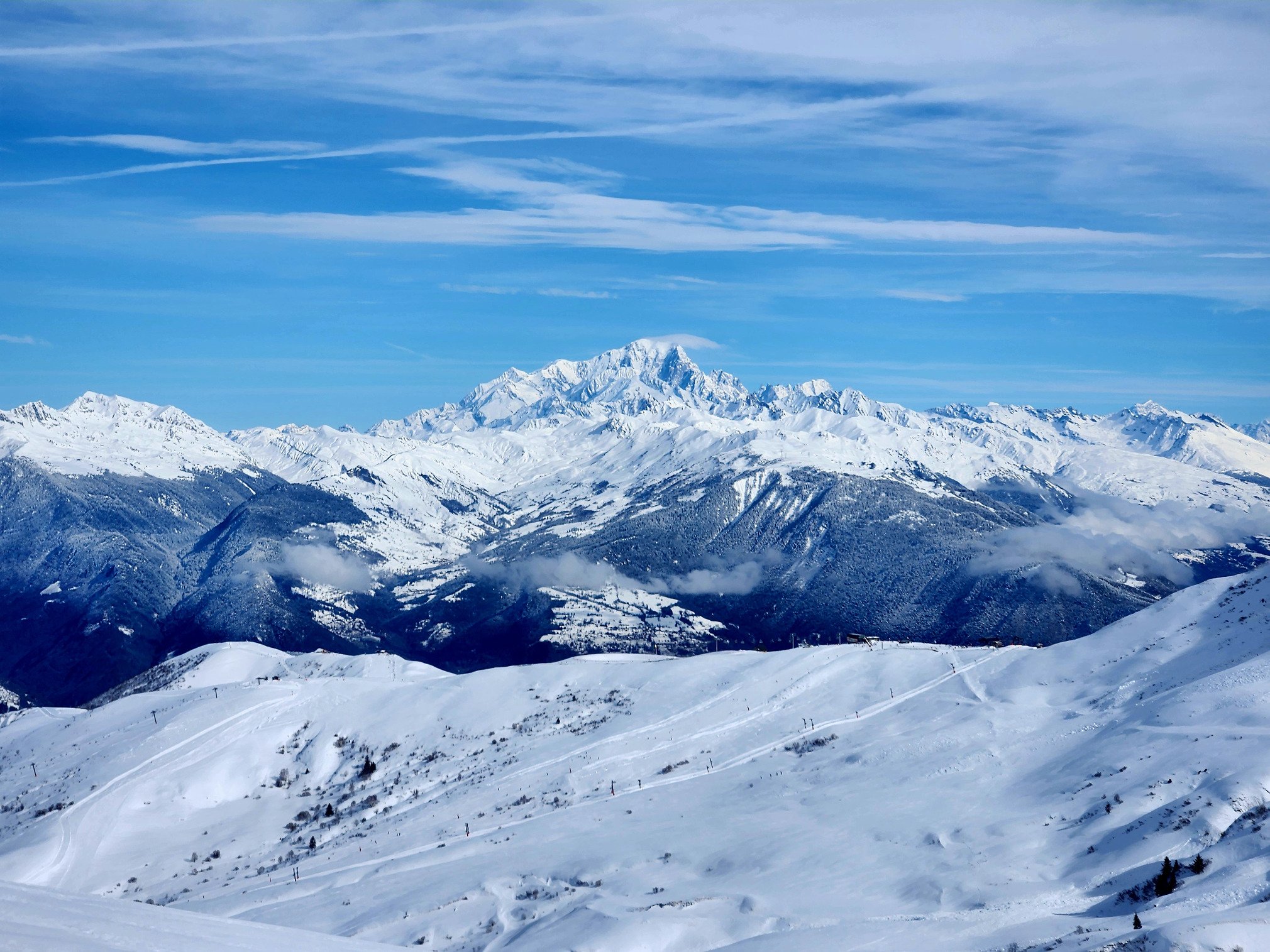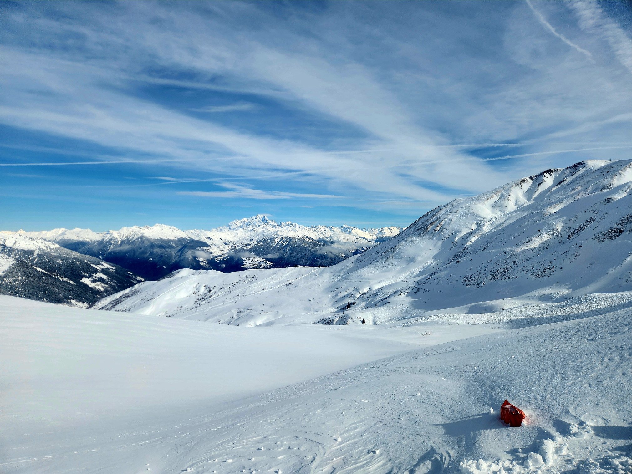 Fin de matinée, le TS Frêne débouchant au col de Madeleine offrait une vue de rêve sur le Mont-Blanc, il avait aussi bien blanchi. Cette remontée offre aussi un paquet de run avec peu de risque, on y a fait quelques rotations (cf vidéo).
