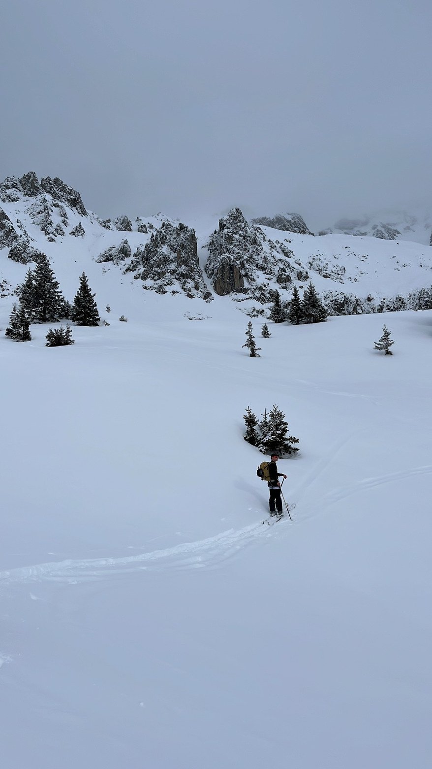 Nous avons finalement opté pour une descente par la droite, en passant au-dessus de barres pour rejoindre un vallon magnifique. On y trouve 10 à 15 cm de neige fraîche sur fond dur, avec une visibilité compliquée au départ, puis de plus en plus agréable à mesure que le temps s’ouvrait.