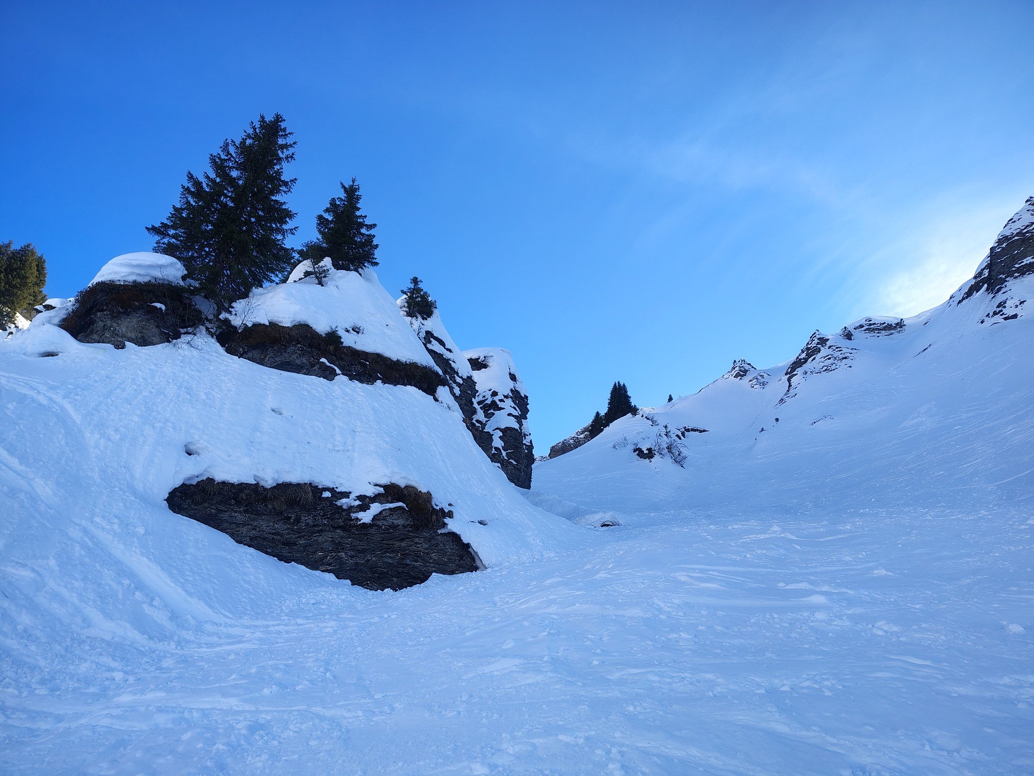 Il faut faire son deuil de la récente poudreuse, elle est tassée, lourde. Le hors piste sur Porcherey est galère, je m'y retrouve seule, et pour cause !