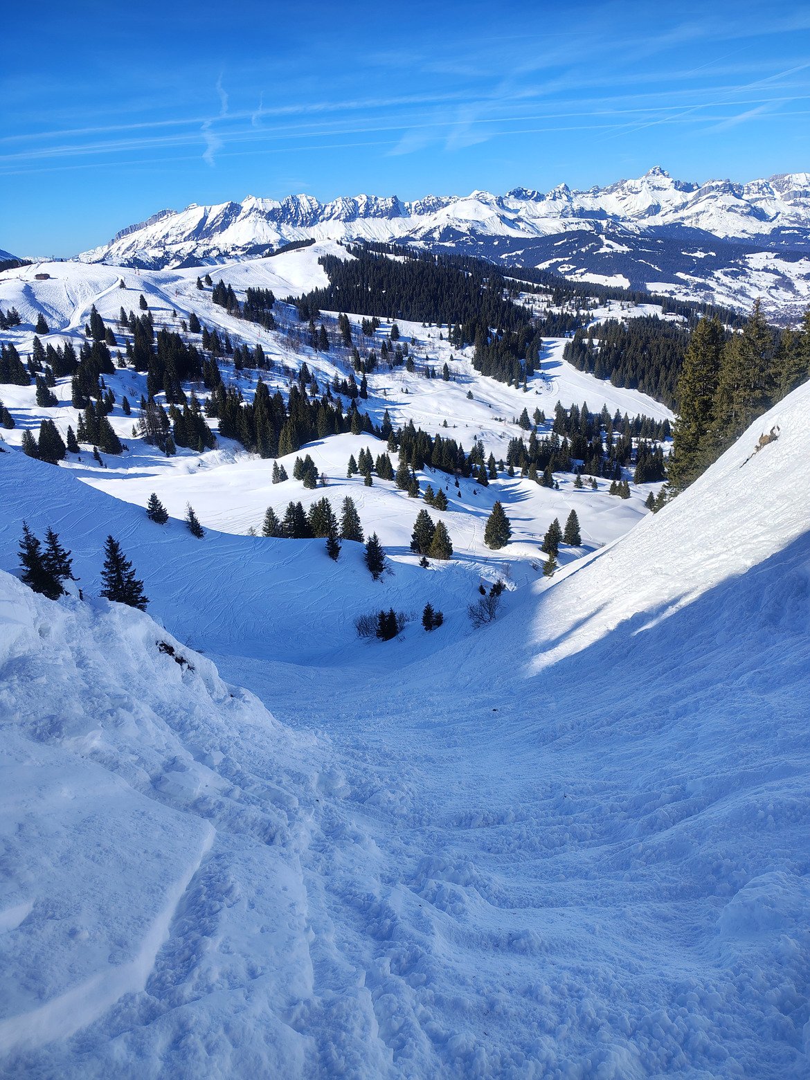 Aujourd'hui, comme les jours précédents, c'est grand beau et grand chaud en Haute-Savoie.. avec un bon regel la nuit, on a une neige très dure pendant une heure à l'ouverture. Le domaine est ouvert désormais partout y compris le Mont Joly, il y a un monde fou et la neige transforme trop vite, le mont Joux affiche 16 degrés. Plein de monde qui se crispe dans les paquets de neige car les gens ne savent pas les négocier. Un damage parfois décevant. Les barres rocheuses de Grand Chamois sont faciles à passer grâce aux fortes chutes de neige récentes.