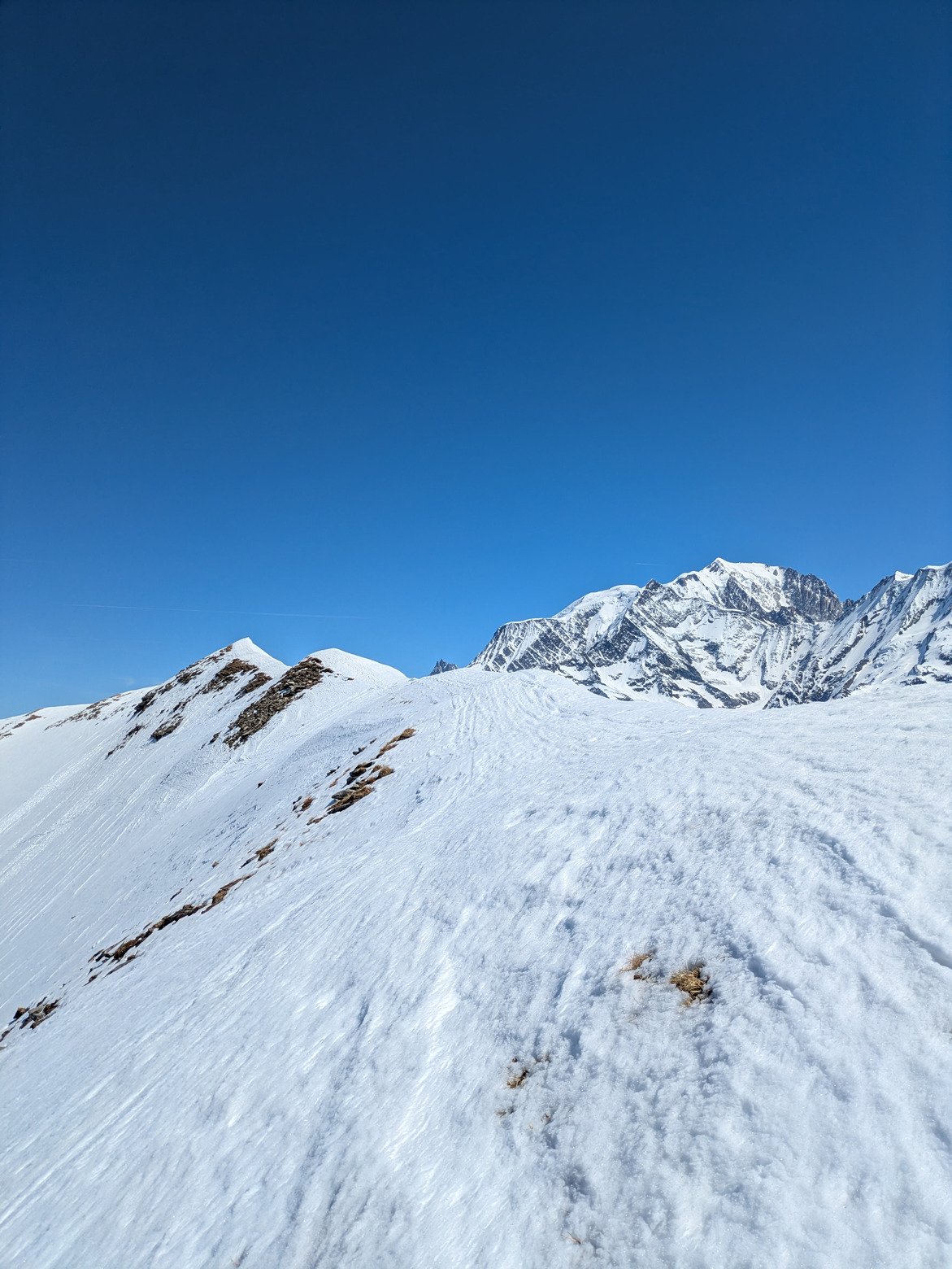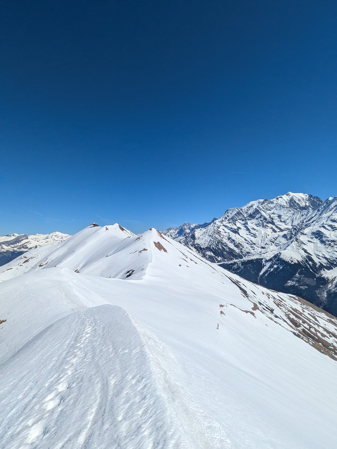 Après quelques pistes aux Contamines (c'est soupe dès 10h30 versant contas, un peu + tard versant hauteluce), je pars du TS de l'aiguille croche pour une traversée main droite jusqu'au niveau du téléski (fermé) du veleray. A partir de là on remonte en peaux jusqu'à l'arête puis la tête de la Combaz (environ 200d+). Une fois sur l'arête il suffit de la suivre jusqu'au mont joly, c'est directement assez sauvage et sympa. L'arête est large mais le versant côté Megève est raide, attention donc. Le mont joly est bien dégarni mais ça monte sans problème, je croise même un lagopède alpin pour la première fois de ma vie. Comme dirait ma mère: "les dieux sont avec nous!"