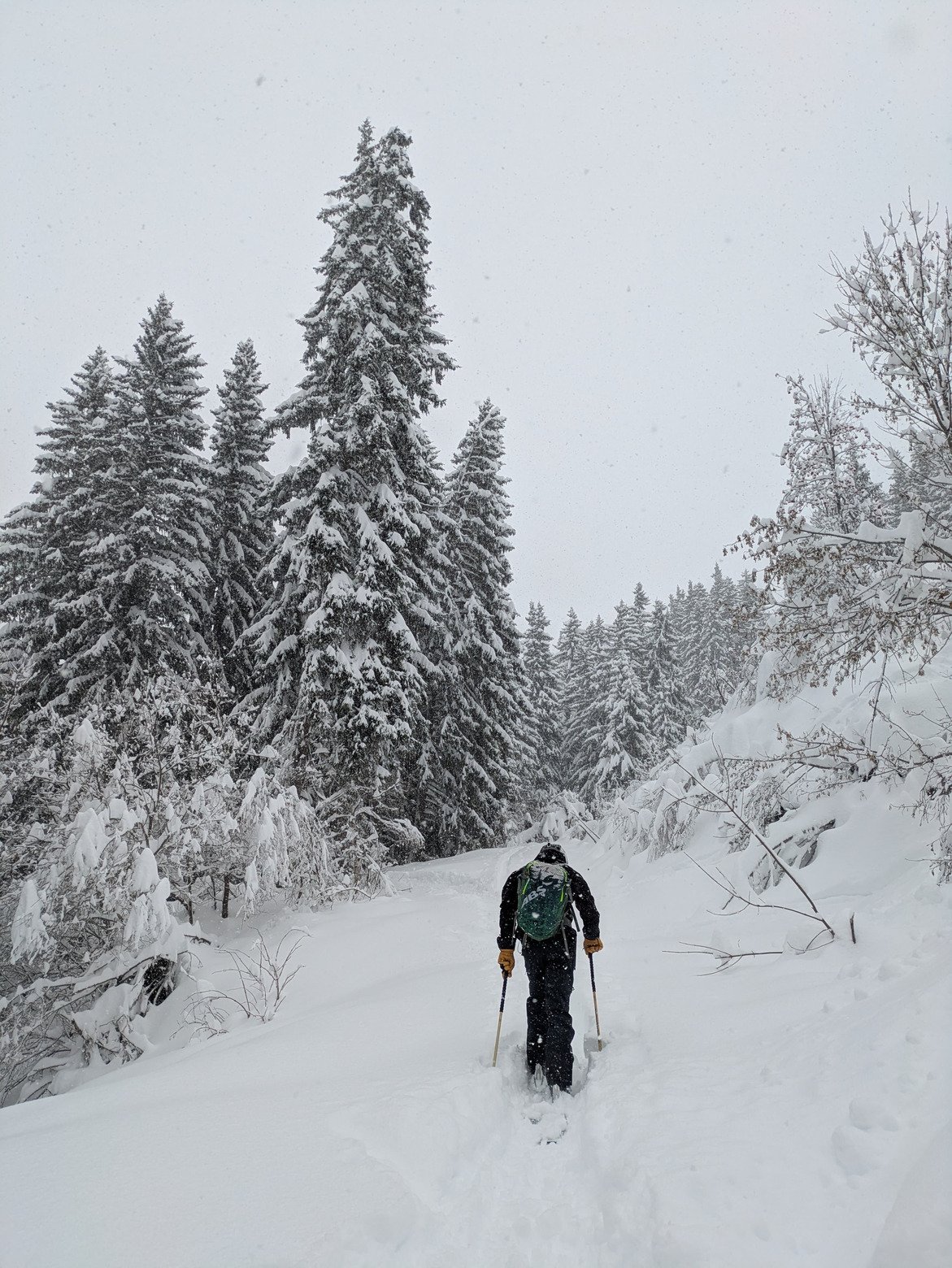 Visibilité plutôt correcte dans les sapins, et il a neigé toute la journée.