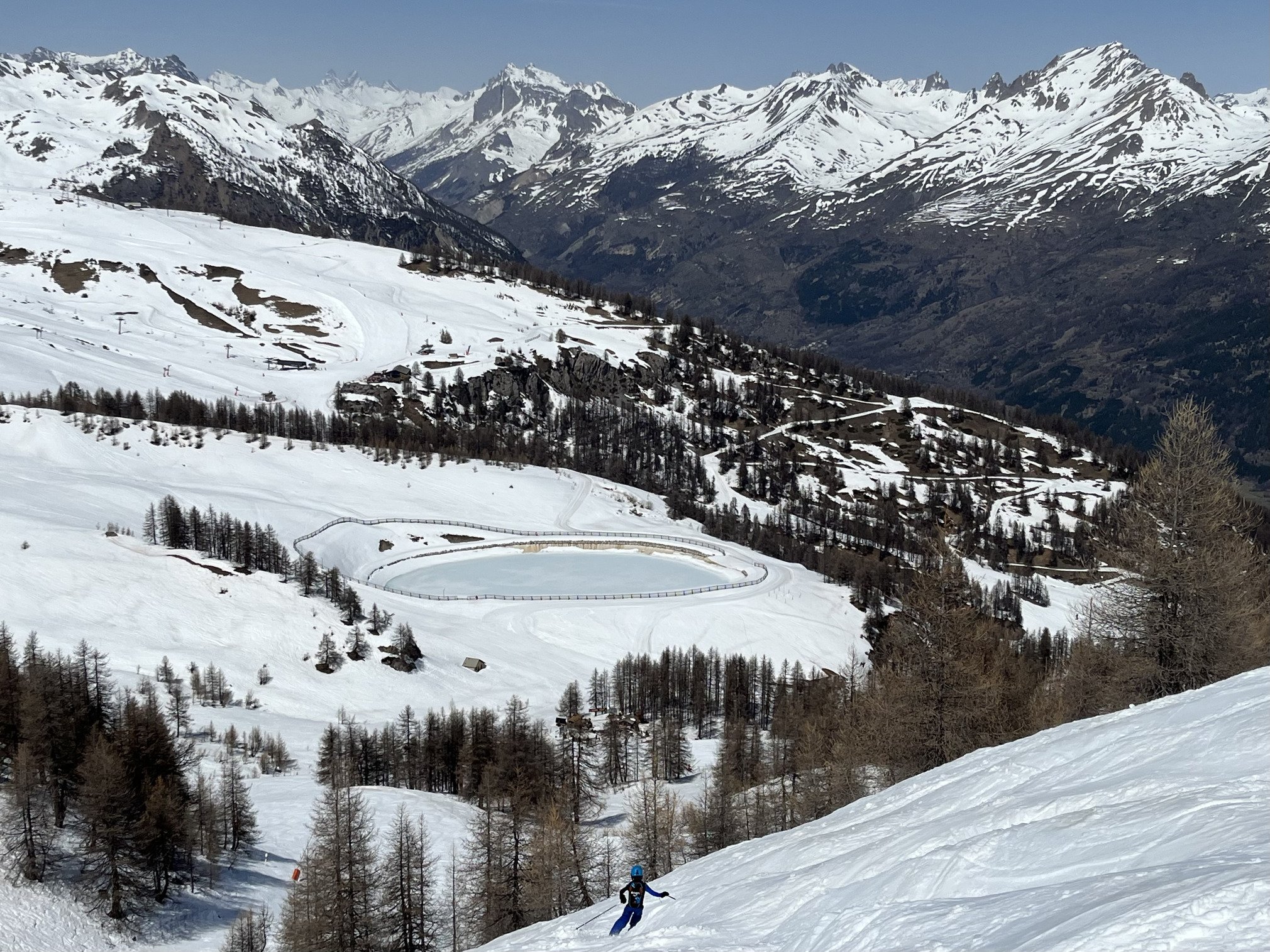 Toute la partie supérieure du domaine est encore bien enneigée : on a vérifié d’un bout à l’autre, de Cibouit côté Monêtier jusqu’au sommet de Rocher Blanc (fermé) côté Prorel même si quelques cailloux de ci de là font leur apparition.