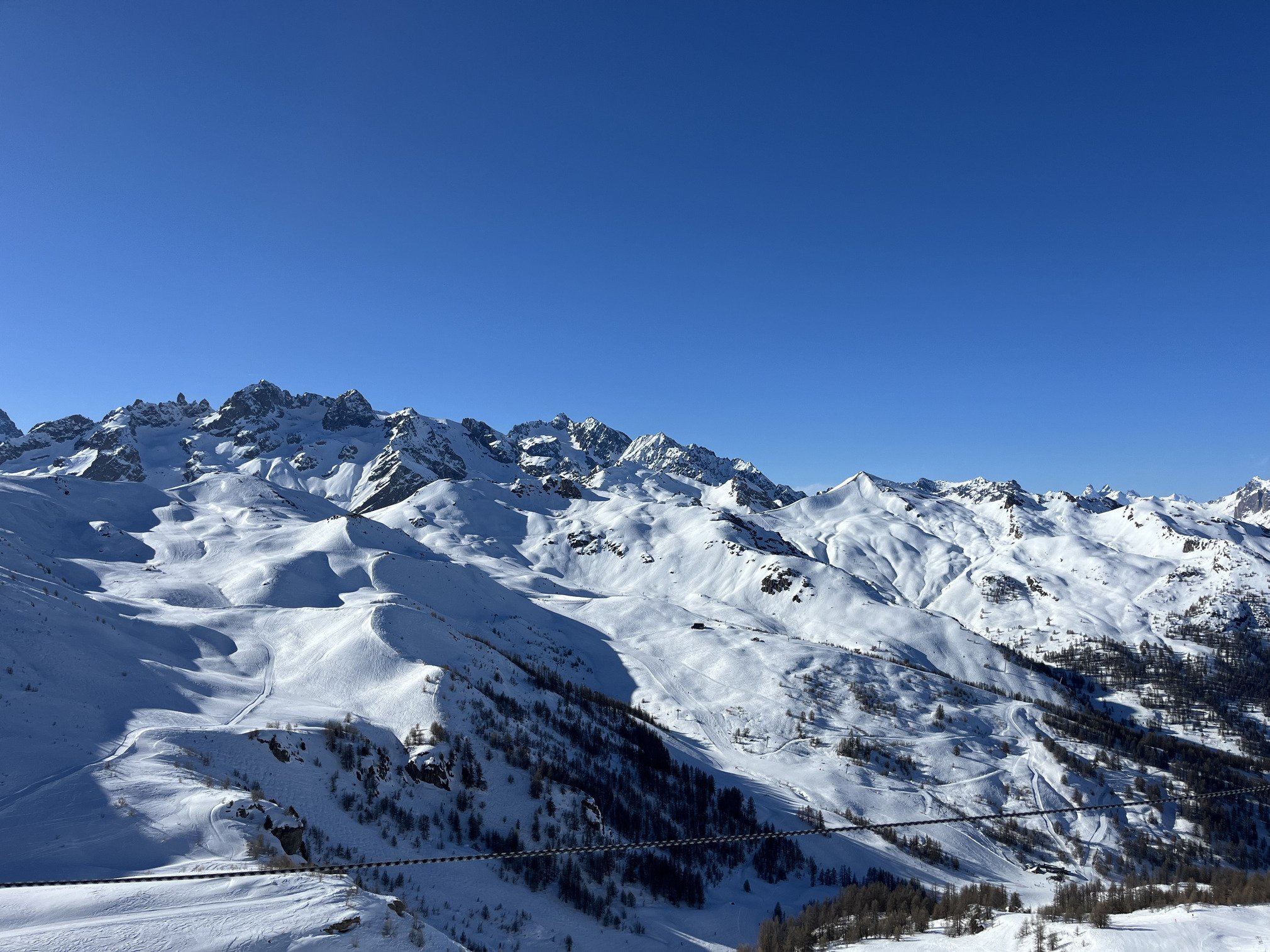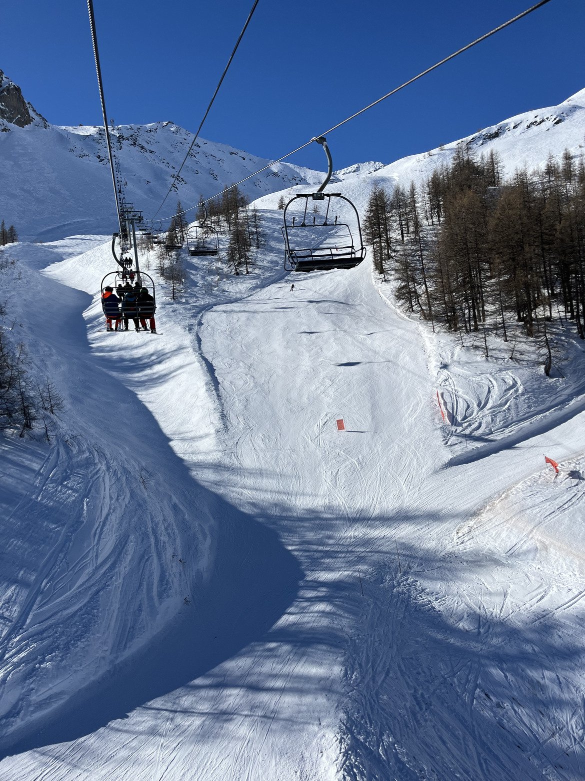 Départ de Monet, Les pistes du slalom sont extra, comme d'habitude. On bascule sur les Valons, HP affreux, c'est trop tôt. Descente au Bez, les pistes sont top, pas encore trop de monde. On re essaye les HP sous le col de Méa, c'est pas top non plus, croutés. Du coup, Casse de Boeuf, incroyable, super bien damée, et pas trop de monde non plus. On décide de rester sur les pistes et se balader jusqu'au Prorel, la neige est de printemps. Franchement, pour une journée Parisien et Marseillais, c'était pas mal du tout. Fluide, et les pistes ne sont pas trop chargées. Pourtant la station est pleine à craquer. On a eu du mal a se garer en arrivant hier soir.