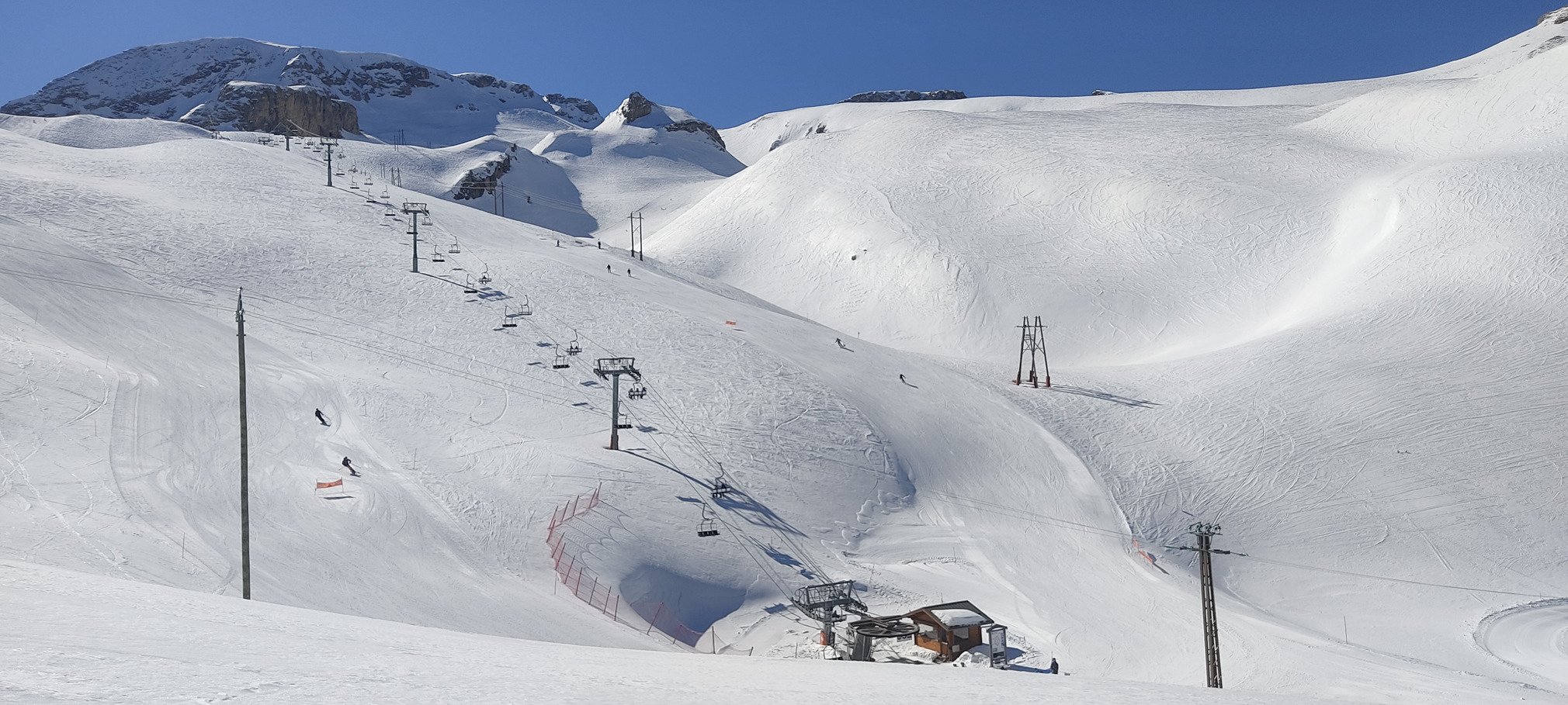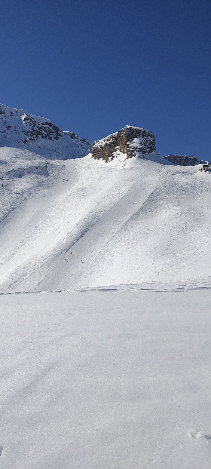 Premier jour de vrai chaleur,pas de vent la neige se transforme dès le matin,le vent froid est tombé et les températures sont élevées même en haut de la station mais l enneigement est toujours excellent et il en restera largement pour la dernière semaine.