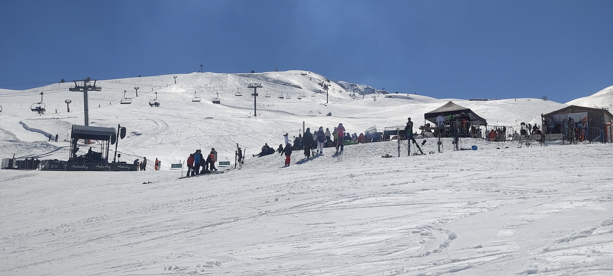 Plus de skieurs car weekend et mix festival qui attire aussi beaucoup de monde (l inconvénient est qu ils n avaient pas prévu assez de sandwich au barbecue à 13 heures on ne pouvait plus y manger !!!)