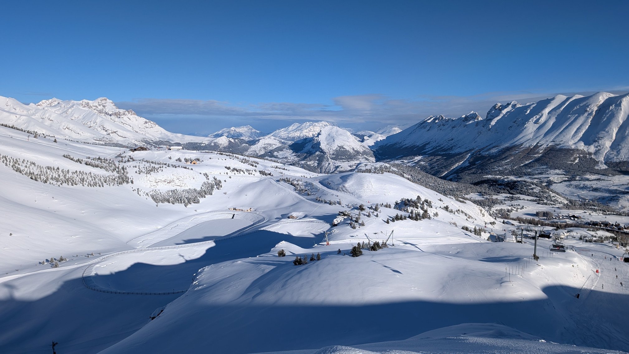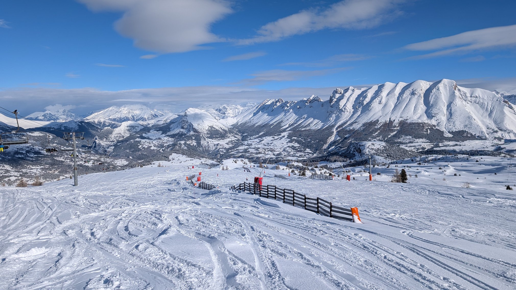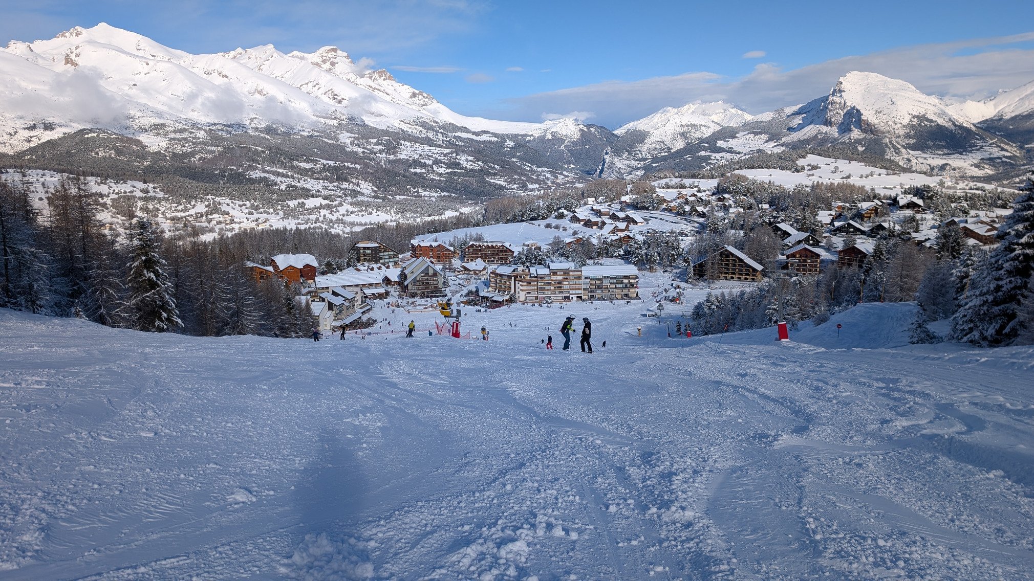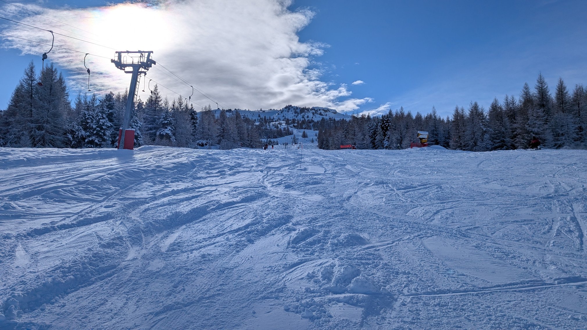 Les pistes était top, les deux tiers préparé, le reste non damé avec 30cm de poudreuse, avec comme coup de coeur la chamois. L'après-midi les pistes non damé son évidemment des champs de bosses. De plus sur certaines pistes du bas, on voit la glace et des cailloux comme le bas de fontettes et cabri. Attention aussi au Haut de seille qui a pas mal de cailloux.