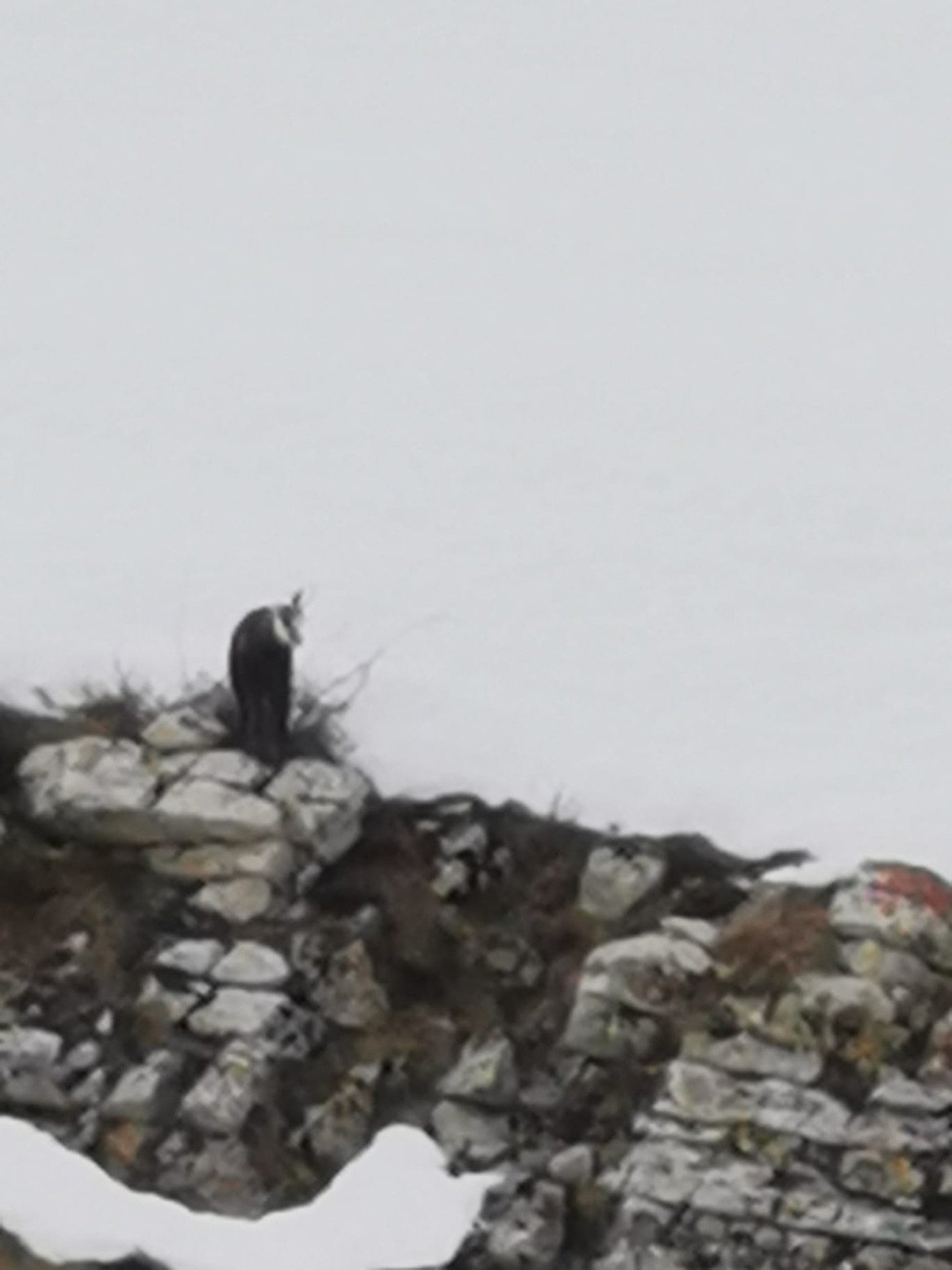 Un chamois solitaire (certainement un vieux mâle) a élu domicile dans la "barre de Pelourenq" en applomb de la piste des marmottes,c est une attraction pendant la descente !!!