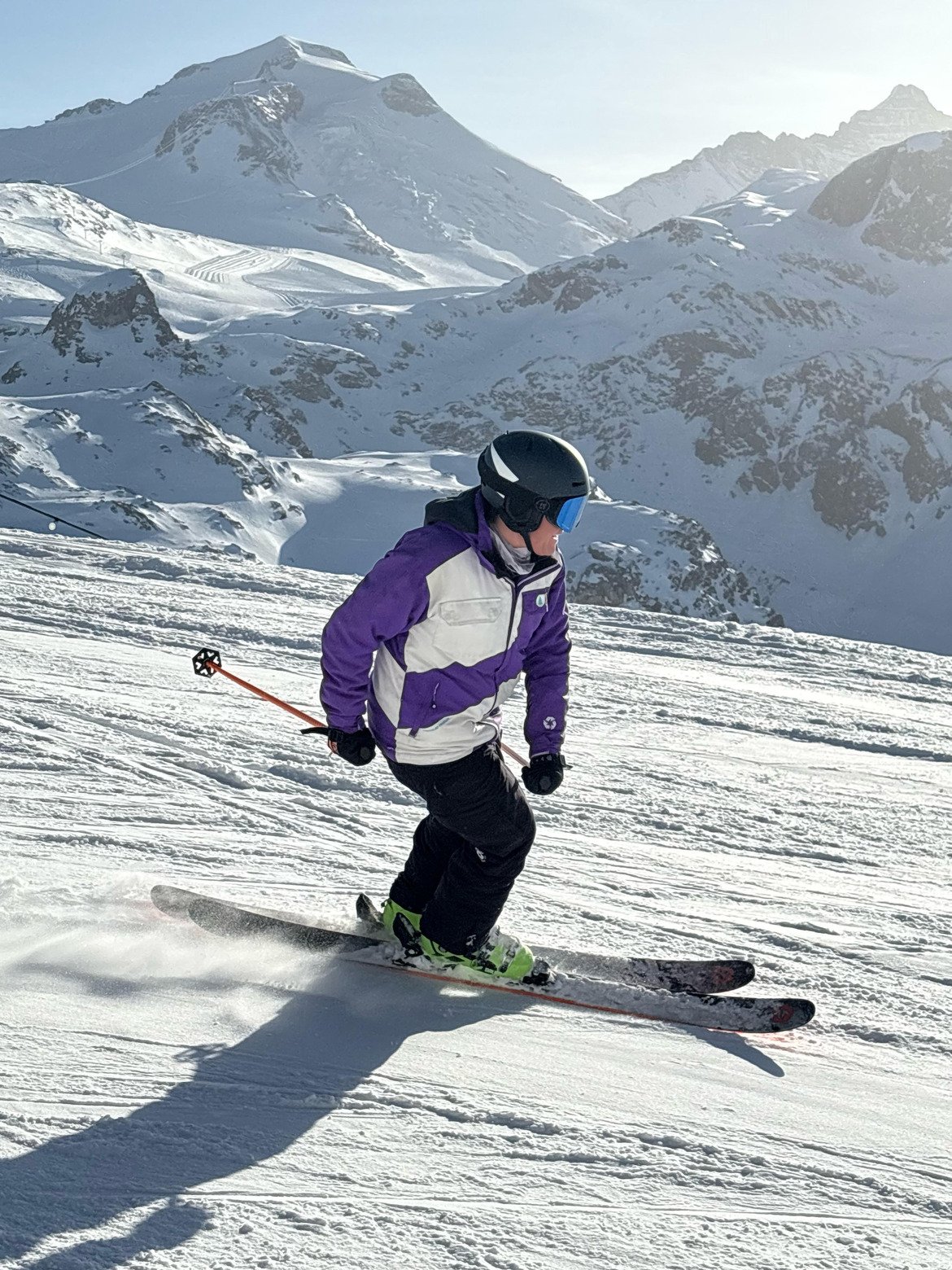Leur gros point de faiblesse au cours de cette journée était les pistes noires avec de la neige plus dure. Quand on fait des petits virages, le ski vient donner énormément de petits à-coups lorsque l’on essaye d’attraper la carre en dérapage avant d’enchaîner de l’autre côté. Je tiens à préciser que ce sont des skis plutôt orientés freeride, et donc que cette piste noire de la face de Bellevarde, très raide, parfaitement damée, avec une neige un peu dure, n’est absolument pas le programme recherché pour ces skis.