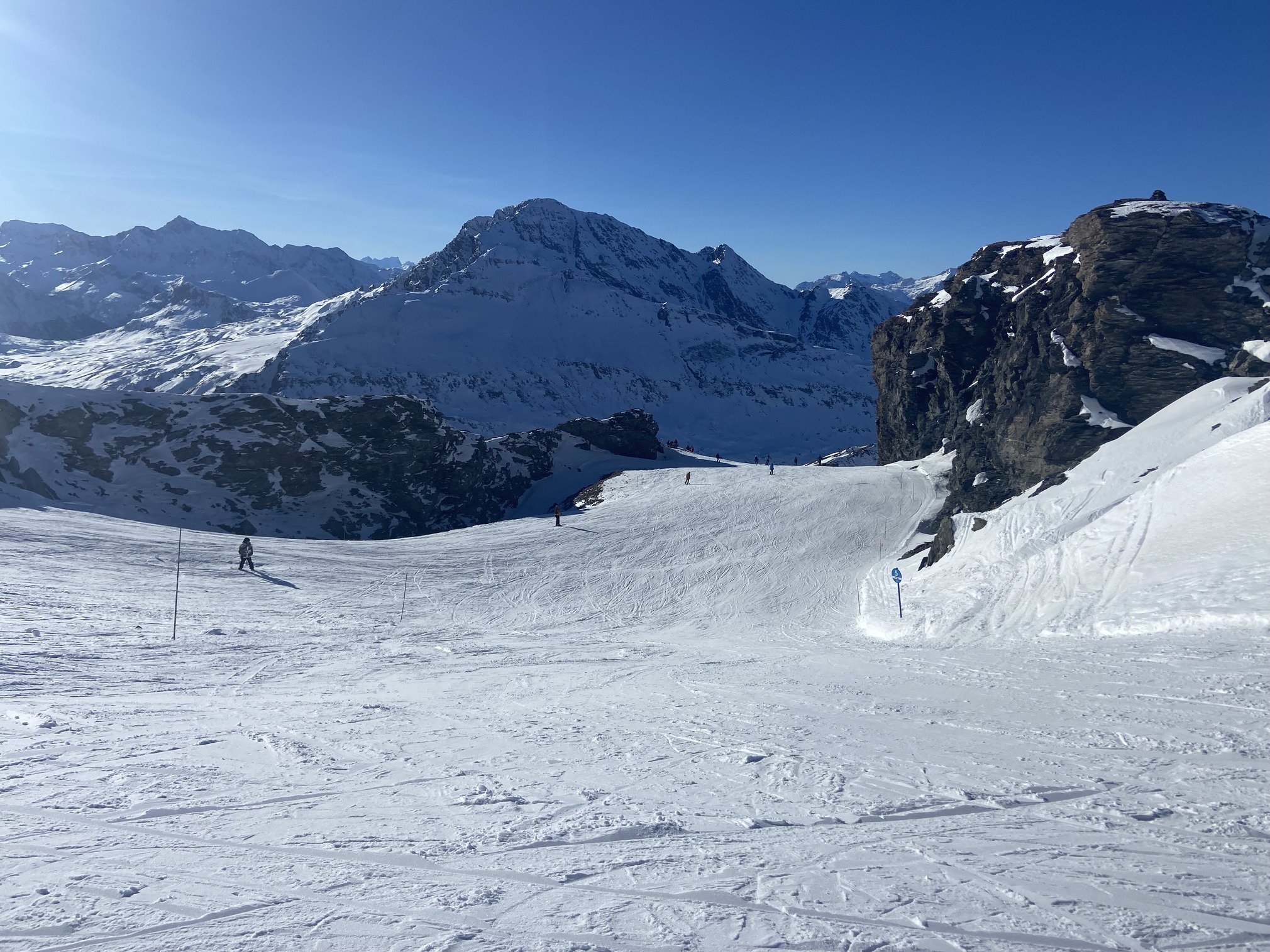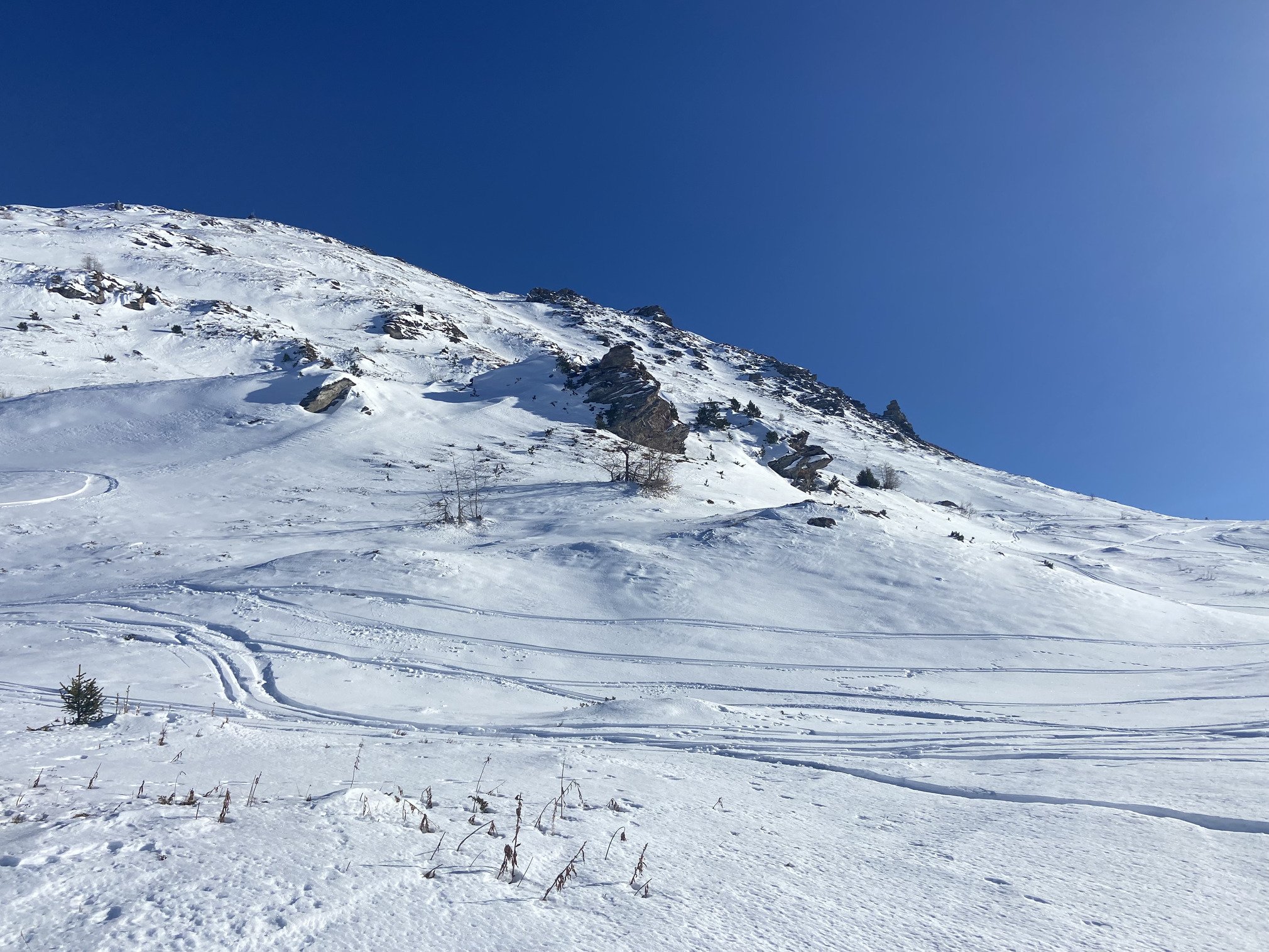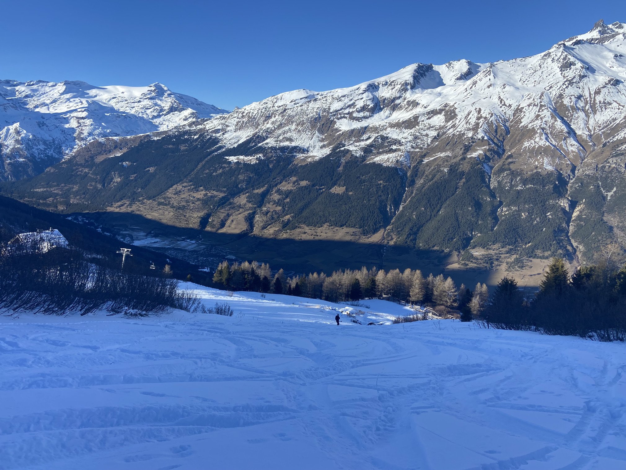 Toujours autant de monde sur les pistes de Val Cenis aujourd’hui… Peut-être même plus qu’hier car attente aux télésièges plus longue et surtout pistes du bas rapidement lustrées par les passages. Pas une seule descente avec de la neige douce sur les pistes du bas, à l’exception de la verte qui descendait au télésiège Colomba. Bon, peut-être bien aussi que mes skis ont besoin d’être affûtés car impossible d’accrocher la neige à plusieurs endroits. Heureusement que les pistes du haut de la station sont restées très agréables à skier, avec un coup de coeur pour la portion de Bleue juste en haut du télésiège de la Met. Un délice pour les jambes comme pour les yeux car c’est aussi de là que l’on peut avoir une vue plongeante sur le lac du Mont Cenis. Une petite exploration de la Noire direction la Met (fermée) nous a menés tout droit vers un coin de poudreuse tel une oasis au milieu du désert. Une parenthèse loin de la foule et de la neige dure qui a contribué à apprécier cette journée de ski pourtant pas super bien engagée. Fermeture des télésièges à 16h40, de quoi profiter de la station qui s’est vidée doucement mais sûrement au fil de l’après-midi ✨