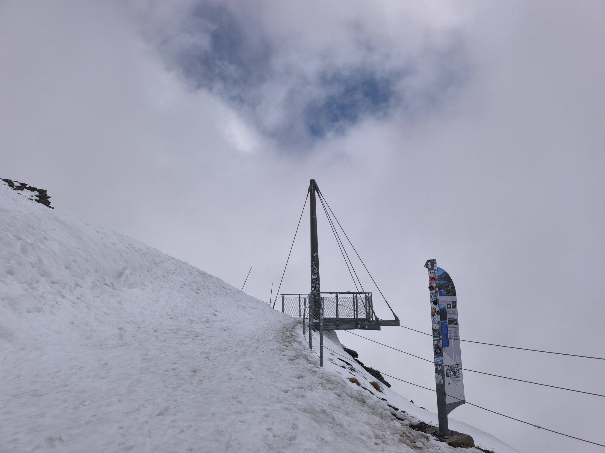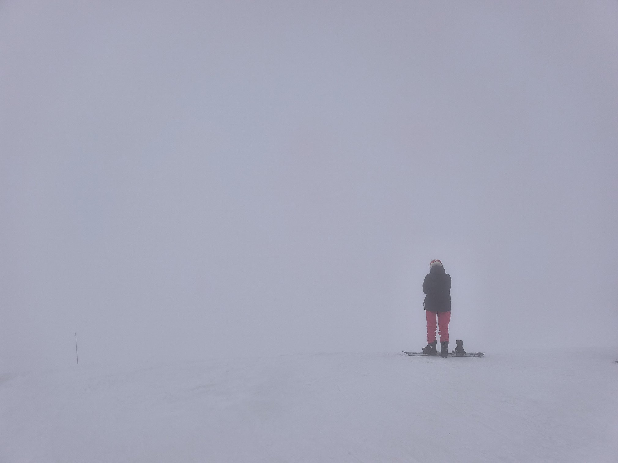 Un beau nuage est venu accrocher le point culminant du domaine accessible par le télésiège Met. Pas de vue vraiment dégagée sur le Lac du Mont Cenis lors de mes passages à la Canopée des Cimes... La première section de la piste rouge Met se retrouve ainsi plongée par moment dans une sorte de "nebbia". En descendant la visibilité redevient ensuite optimale créant une ambiance féerique.