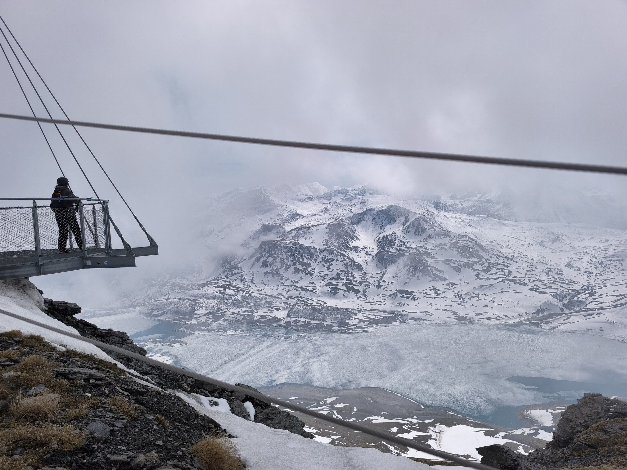 C'est la première fois que je vois autant de monde à Val Cenis un jour de la fermeture. Ce n'est pas bondé comme pendant les vacances de Février mais c'est bien animé sur les pistes et le belvédère de la Canopée des Cimes a du succès. Les sièges du TSF de la Met ne désemplissent pas jusqu'à l'heure de sa fermeture à 16h20. Il est vrai que c'est grâce à eux que l'on peut aller contempler le magnifique lac du Mont Cenis. D'autant plus que le spectacle se modifie en permanence avec la "nebbia" plus ou moins présente aujourd'hui. Ce phénomène climatique est vraiment fascinant à observer depuis le sommet de la Met !