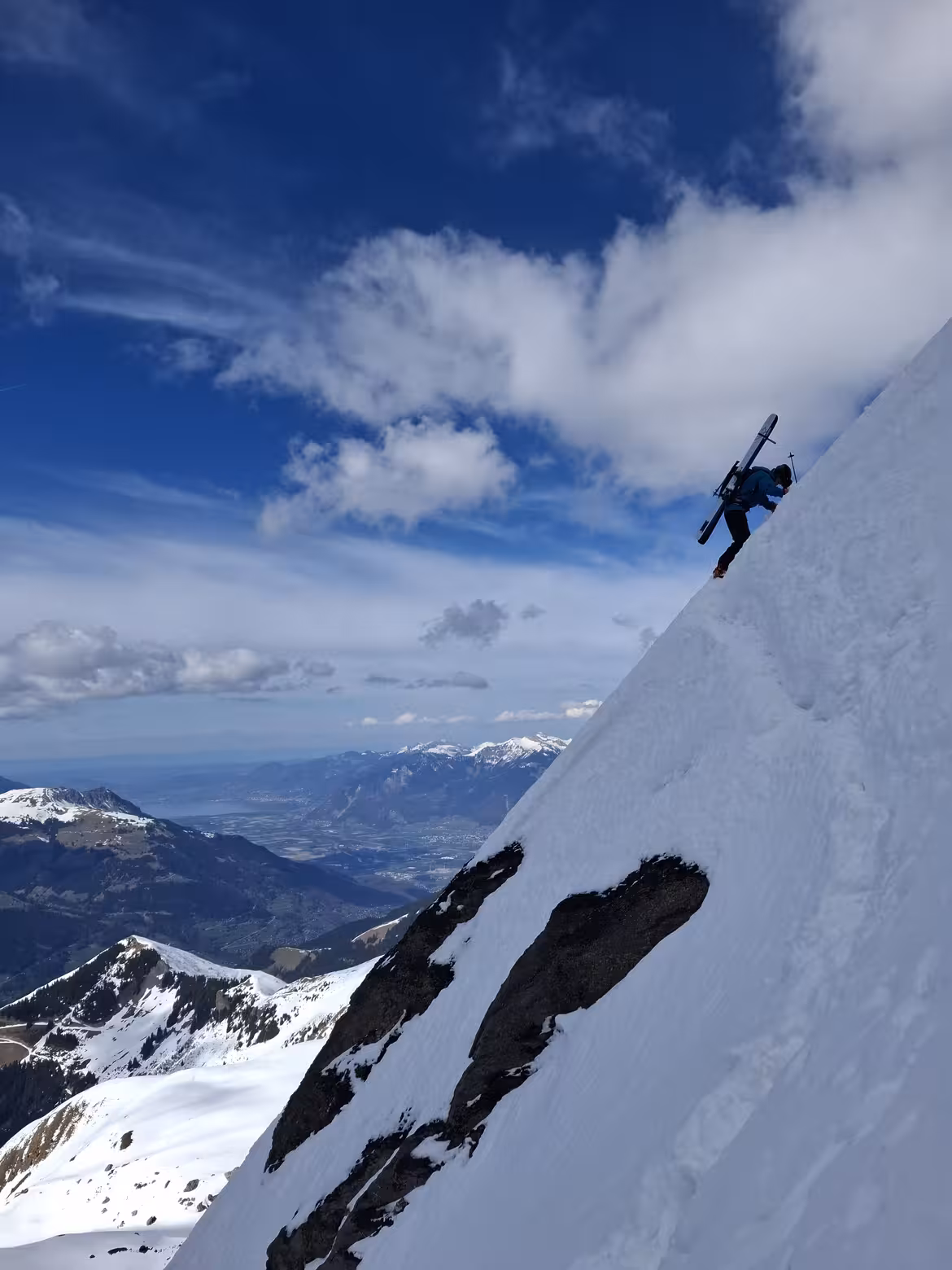 Après un long portage dans une neige bien pourrie (bonne croûte de quelques centimètres et neige qui a subi beaucoup de transformations en dessous), on a du mal à suivre les anciennes traces, car de la neige a coulé dessus. C’était donc assez physique.
