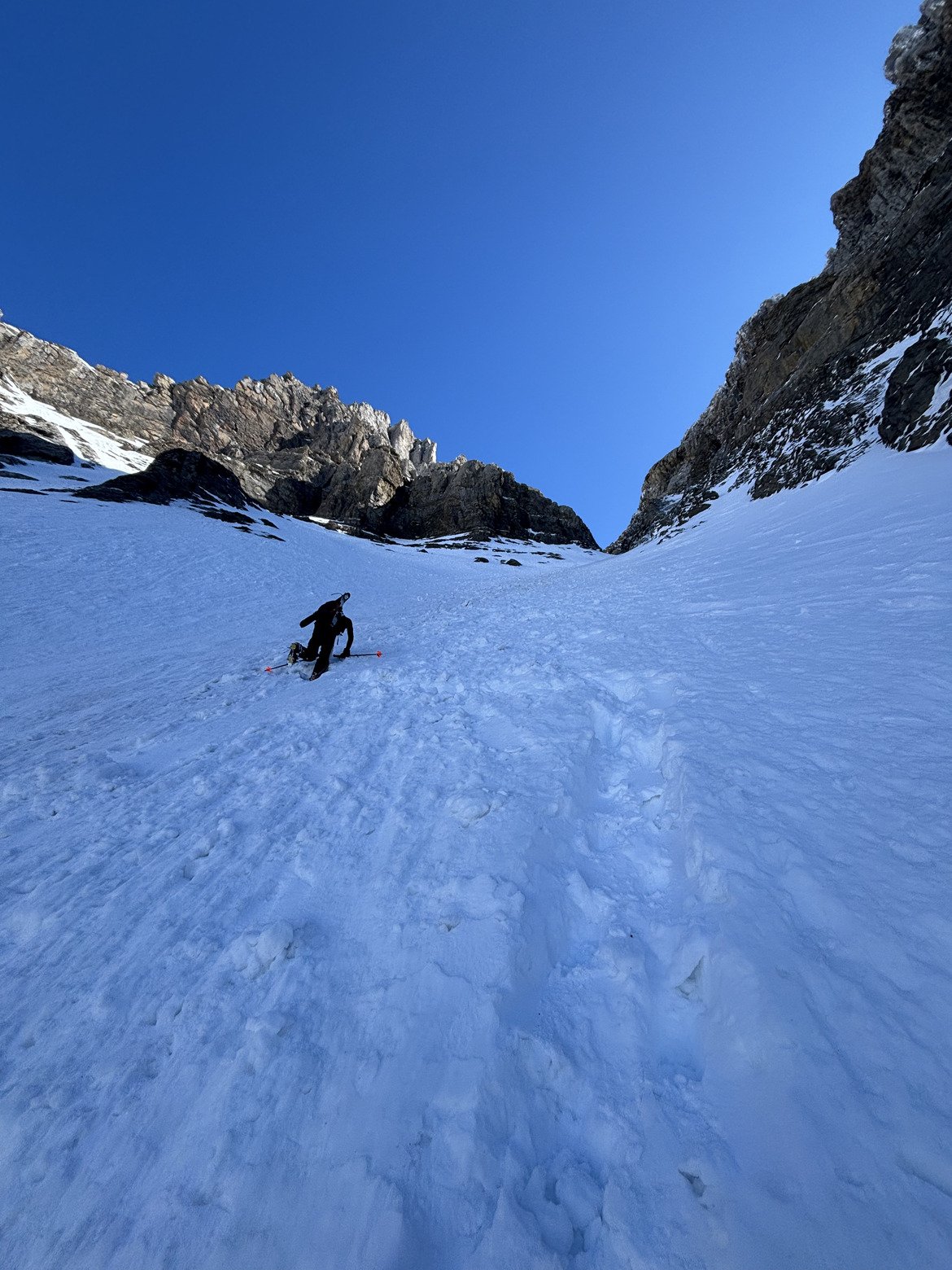 Il y a eu quelques passages corrects, mais globalement la descente était bien pourrie. Le seul bon passage, c’était le gros cône en dessous du couloir ; après, c’est une soupe ultra collante et bien épaisse.