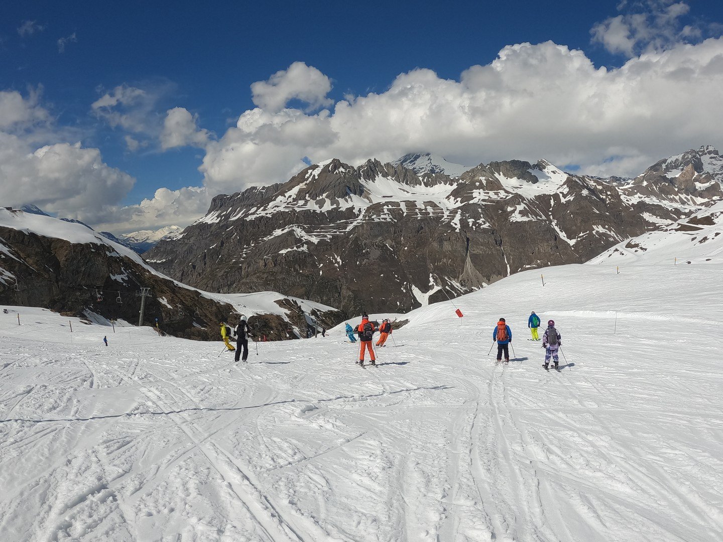 Par chance, la couverture nuageuse se déchire juste à temps pour notre fondue annuelle ! Entre le soleil retrouvé, une ambiance bien arrosée et une neige parfaitement décaillée, l'appel du hors-piste devient irrésistible, avec le summum sous les Pyramides. Bref, une journée mémorable : alors qu'il ne reste que quelques précieuses semaines de glisse, cette saison s'achève en beauté et restera gravée dans les annales !"