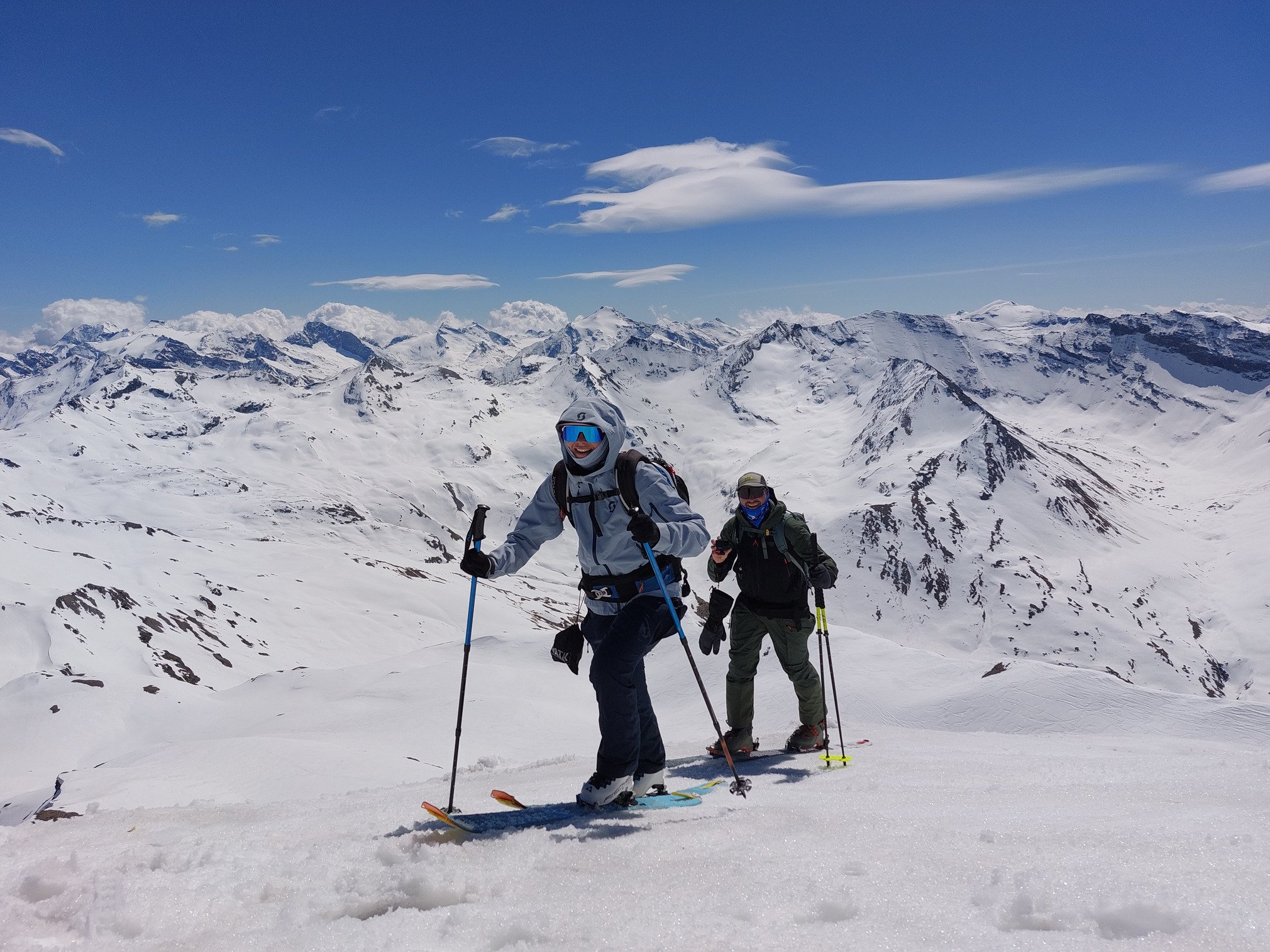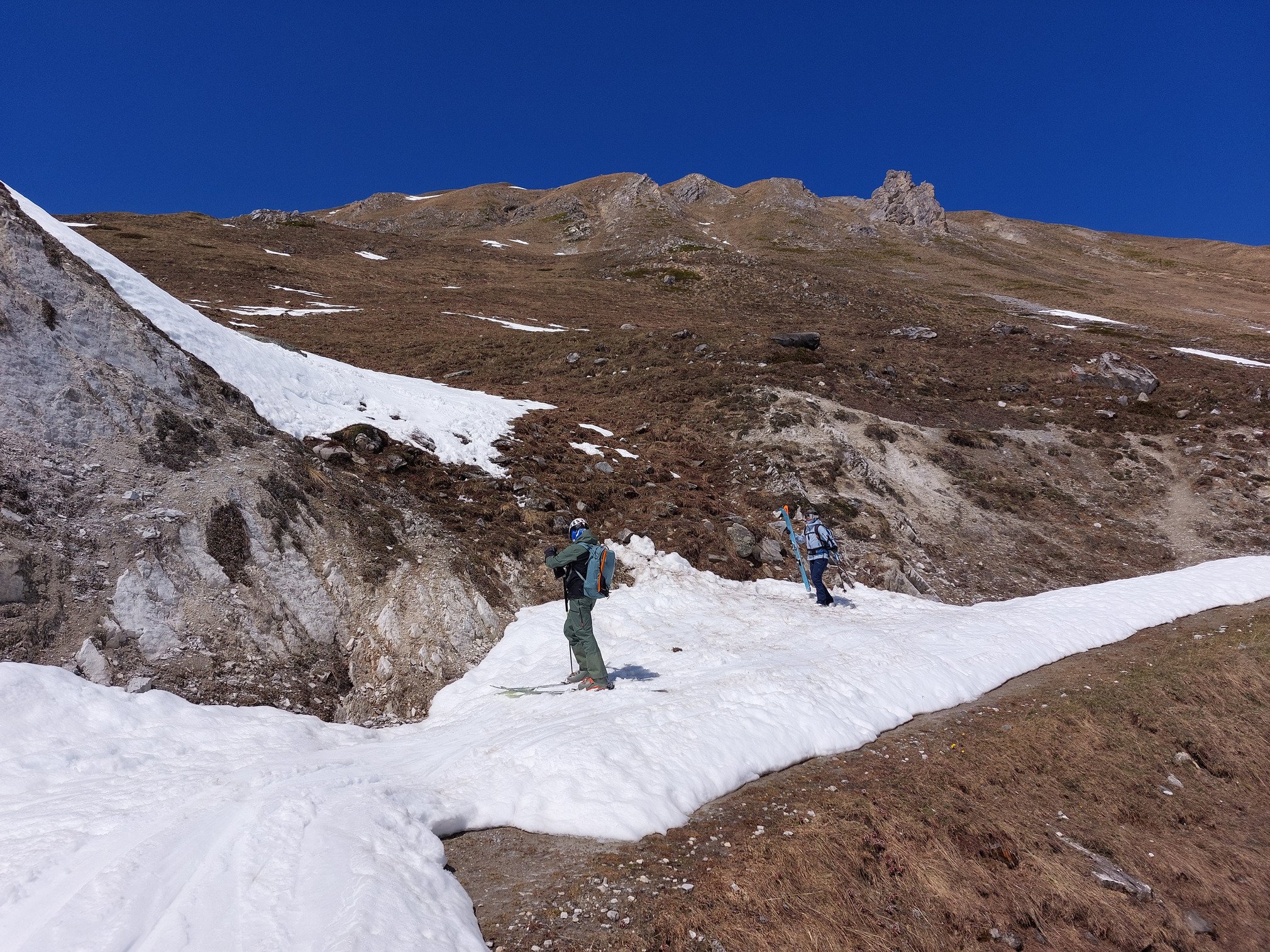 Mais donc faut quand même se taper 1000m de D+ pour arriver au Pic en ski de rando, et là, dilemme : soit essayer de trouver l'entrée et le descendre pour pouvoir dire qu'on l'a fait, mais ce ne sera pas du grand ski... ou alors skier en grandes courbes la face SE. Au final, on n'a pas skié le couloir mais on s'est fait bien plaisir en trouvant même de quoi faire nos traces 😎😎 retour par la vallée du Manchet à travers les (très nombreuses) marmottes, ça skie bien jusqu'au TSD, et ça, c'est cool 👍👍