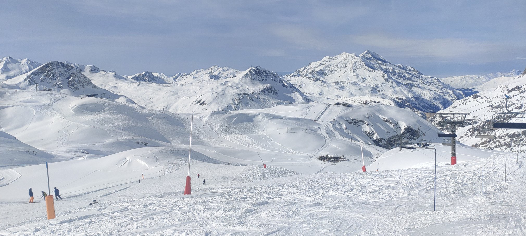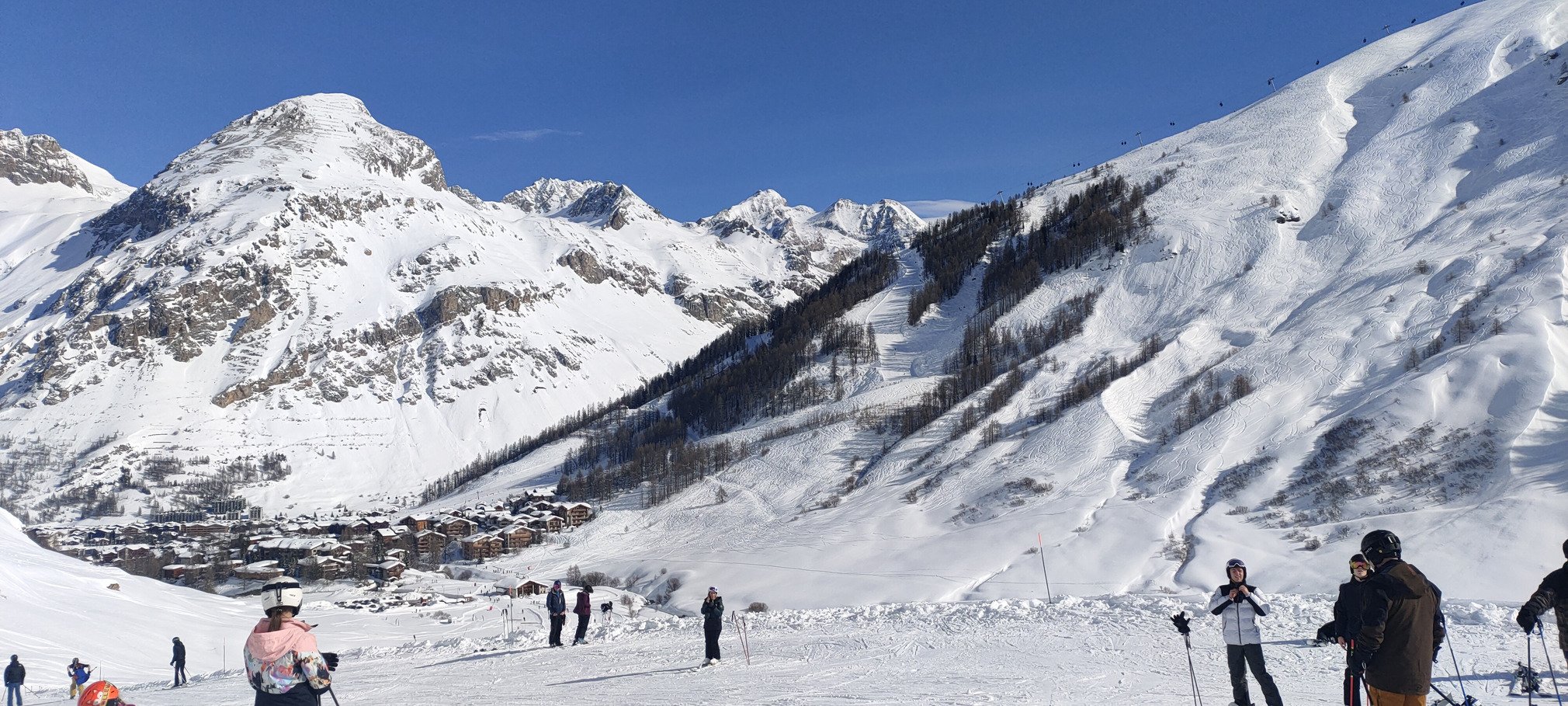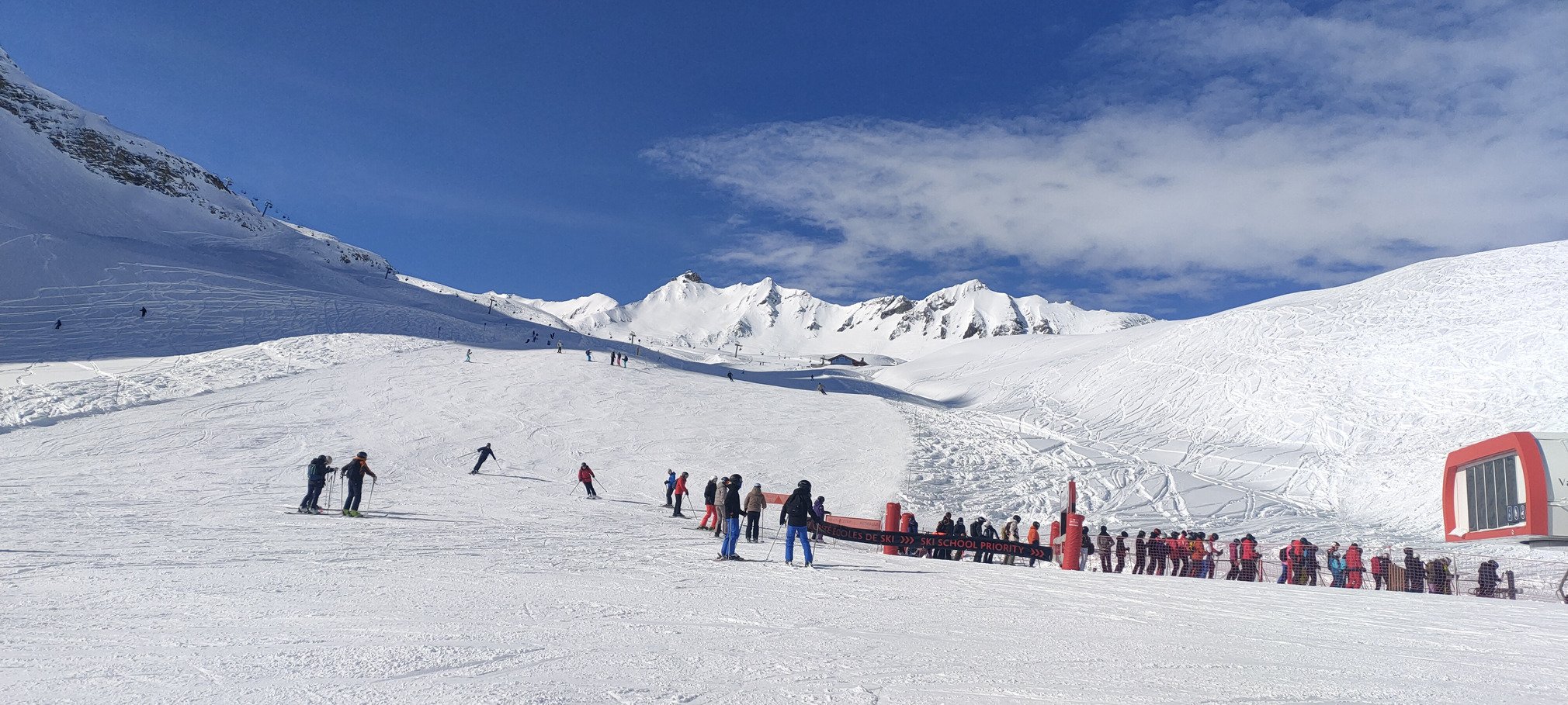 Beau temps belle neige ce dimanche à Val d'Isère... et forcément du monde pour en profiter. Cela dit, ça ne s'est pas traduit par beaucoup d'attente aux remontées (5 minutes grand maximum, bref pas gênant). Certaines pistes étaient bien denses, avec un niveau d'ensemble pas forcément très élevé, mais pas ou très peu de skieurs qui évoluent à une vitesse trop rapide pour leurs capacités. En résumé, ça restait plutôt fluide malgré le monde.