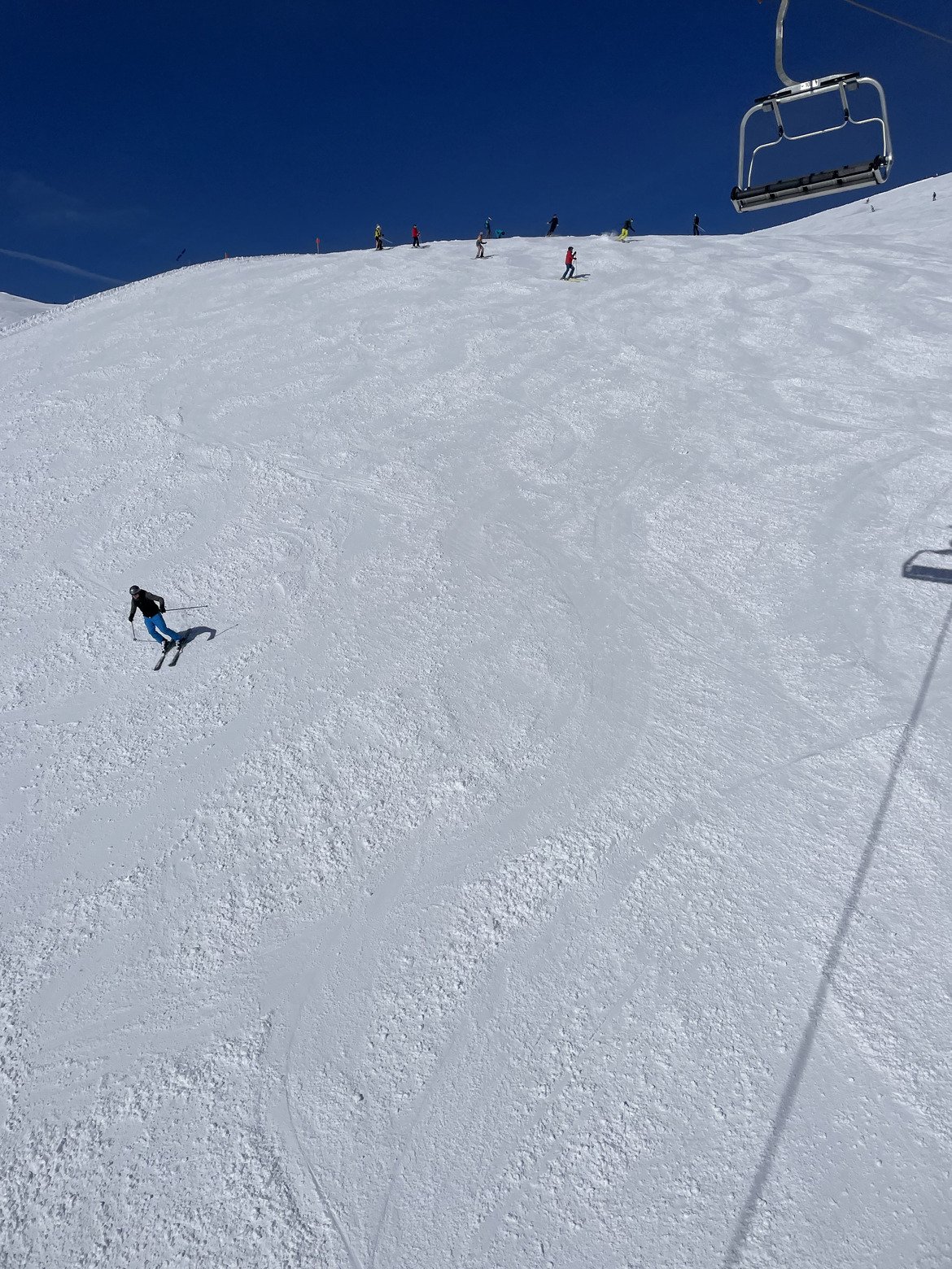 Les pistes exposées sud deviennent vite de la soupe, il ne gelait même pas ce matin à notre départ à 9h. Les pistes transforment rapidement avec bosses, amas de neige lourde. Les pistes au Nord ou restant à l’ombre sont correctes, et même agréables.
