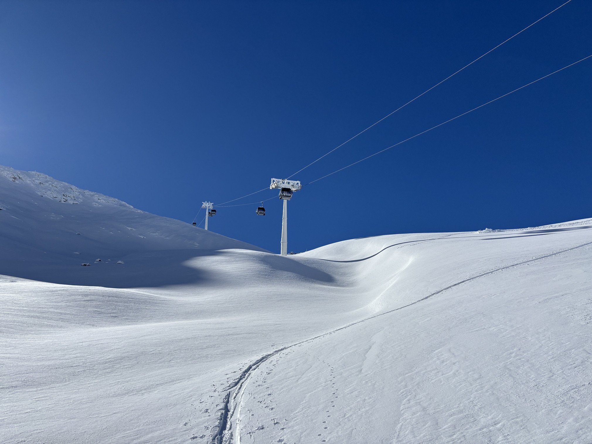 Je monte par la piste «Flocon» déjà bien bousillée par des engins motorisés, qui auraient pu avoir la délicatesse de passer par la route principale, puis j’attaque «Moraine» dans la pente en suivant une trace de dameuse puis j’enchaîne sur «Asters» où les cabines toutes neuves sont en rodage.