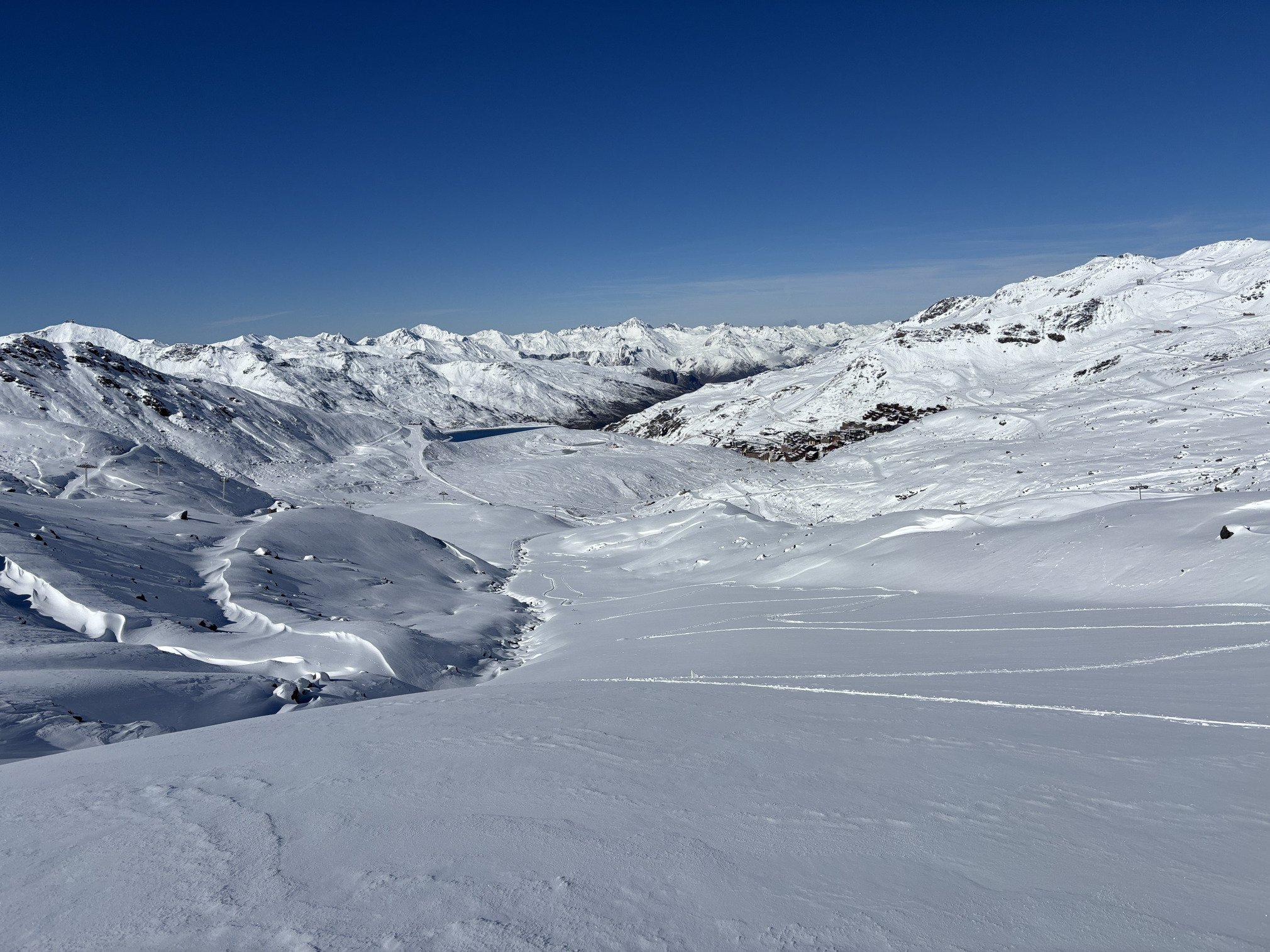 À partir de 2900 m l’air semble plus chaud, ça tape, mais j’arrive en haut et je profite du panorama sur le Bouchet et la Maurienne, avant de redescendre «Asters» puis «Génépi» dans une neige croutée assez technique de haut en bas, «Flocon» me ramènera non sans pousser vers le haut de la station.
