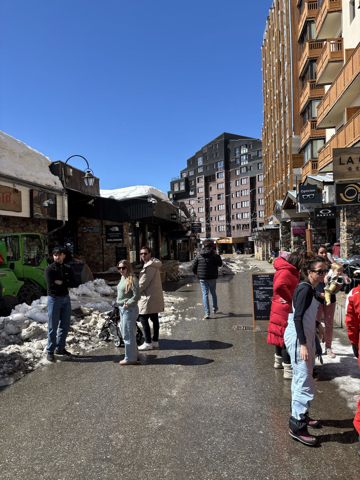 On démarre vers 10h15 pour arrêter à 13h, 6000m de D- et 47 km ça suffit comme ça ensuite c’est retour au camp, douche, vêtements de ville, Stetson en raphia et Vuarnet glacier bleues vintage sur le pif on va se poser en terrasse avec vue quand soudain, la redoutable « brigade des flocons » bellevilloise (=nos municipaux bien aimés) entreprend de nous déneiger la rue de Caron pour la belle saison et ce faisant nous abreuve de décibels à coup de mini chasse-neiges…improbable en ce dimanche de Pâques 🙅🏻♂️