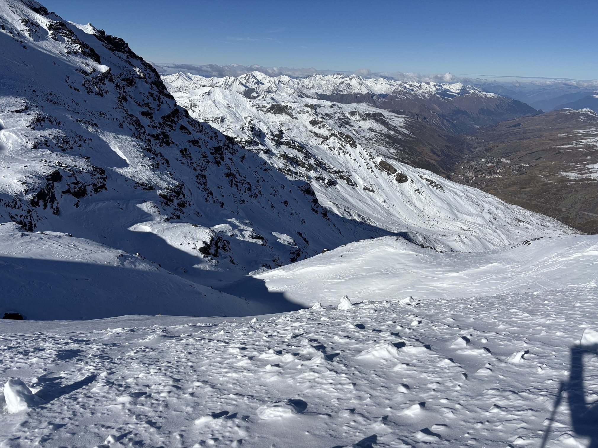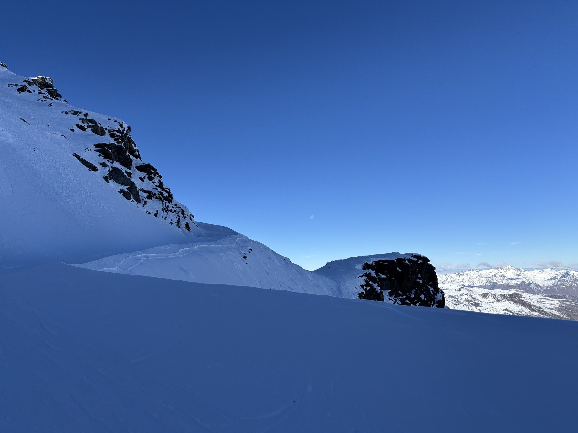 Je zieute dans la combe cartonnée, tout en bas les canons ont craché sur « Gentianes », il semble possible de rallier le virage mais étant en solo je m’abstiens prudemment 🥶