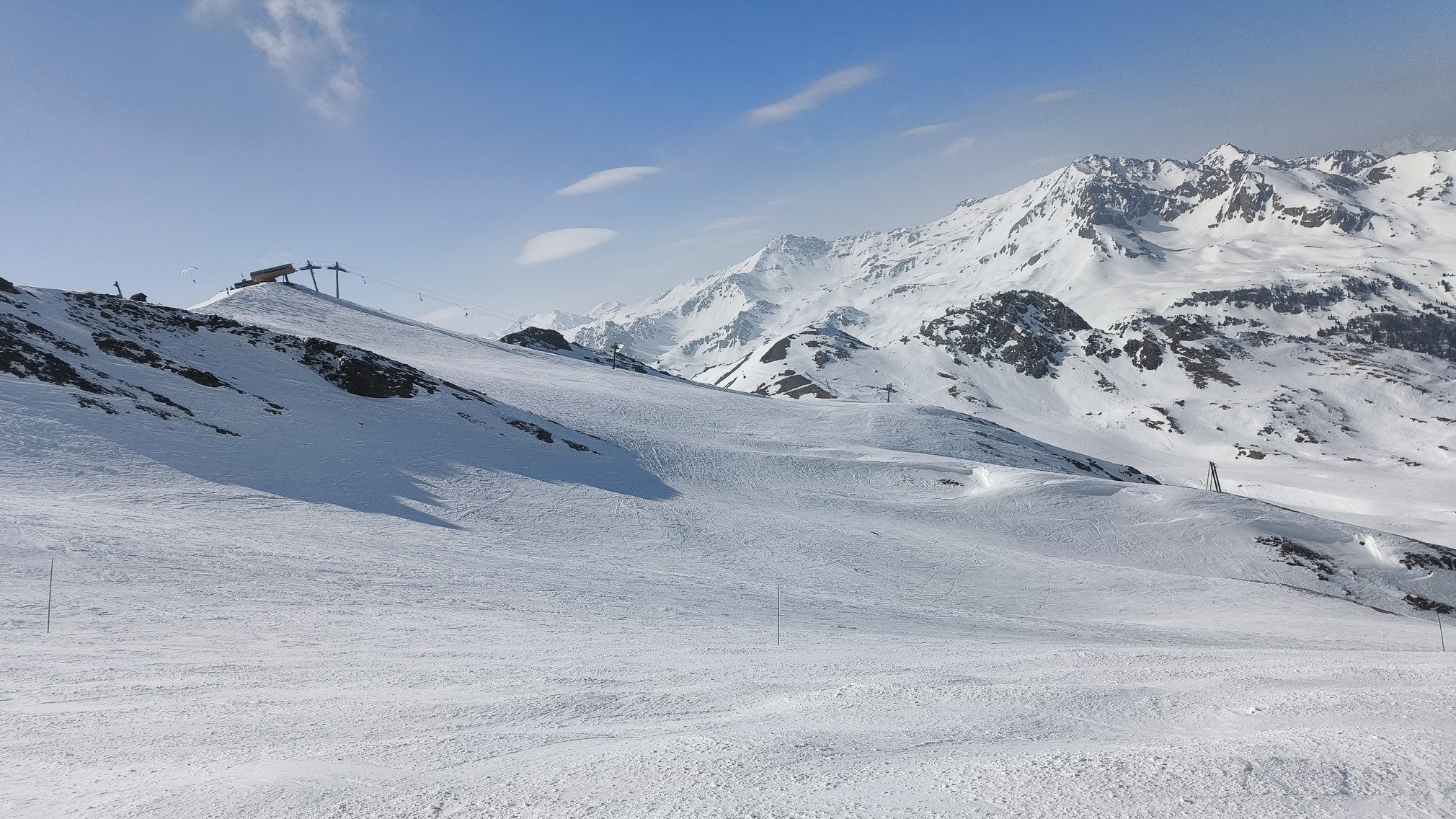 Il y a un peu plus d’air que la veille et une sensation plus fraîche. Les conditions restent très correctes sur le domaine, avec encore pas mal de neige en place et même de grosses accumulations par endroits.