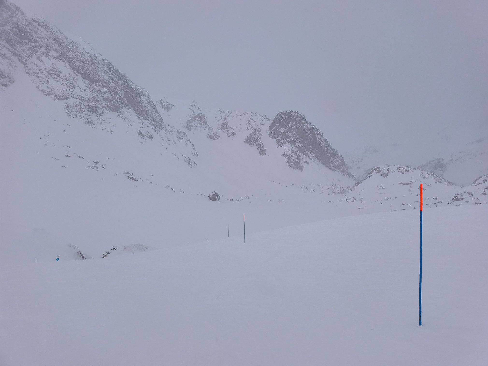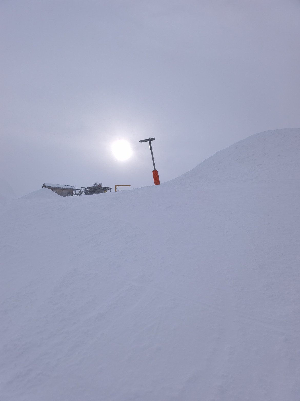 Ce n'est que dans l'après-midi vers 15h que l'impression de beau temps a laissé progressivement place au "jour blanc" dans la partie haute du domaine. Puis quelques flocons soufflés par le vent de Sud qui se renforce en altitude ont fait leur apparition un peu en mode "giboulées". Ambiance d'autant plus printanière que les températures se sont adoucies (+3 degrés en bas de la station à 1550 m et -5 degrés au sommet à 2737 m vers 14h).