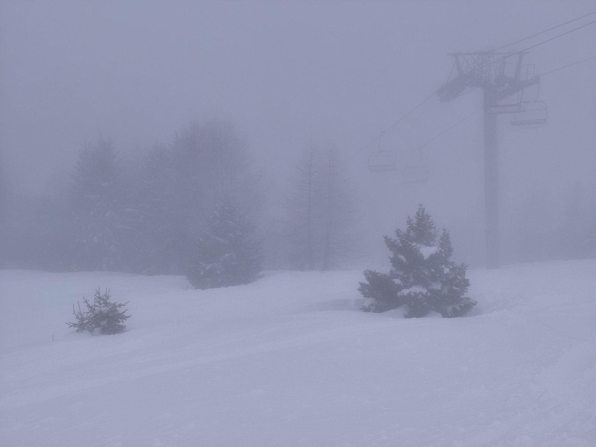Quant à la visibilité elle est en effet bien réduite à cause d'un brouillard très dense qui s'est installé. Et le vent de Nord-Ouest a eu du mal à le balayer. Dans l'après-midi quelques trouées de ciel bleu ont permis de respirer un peu et d'y voir clair pour la dernière descente.