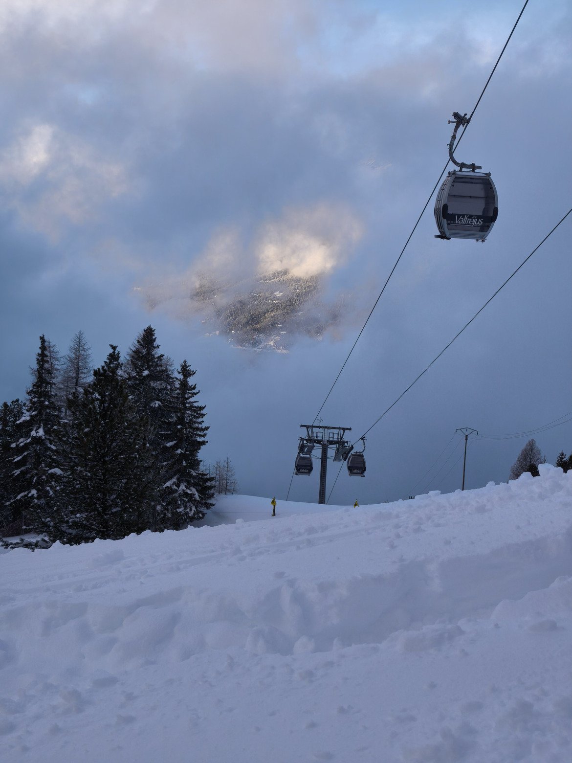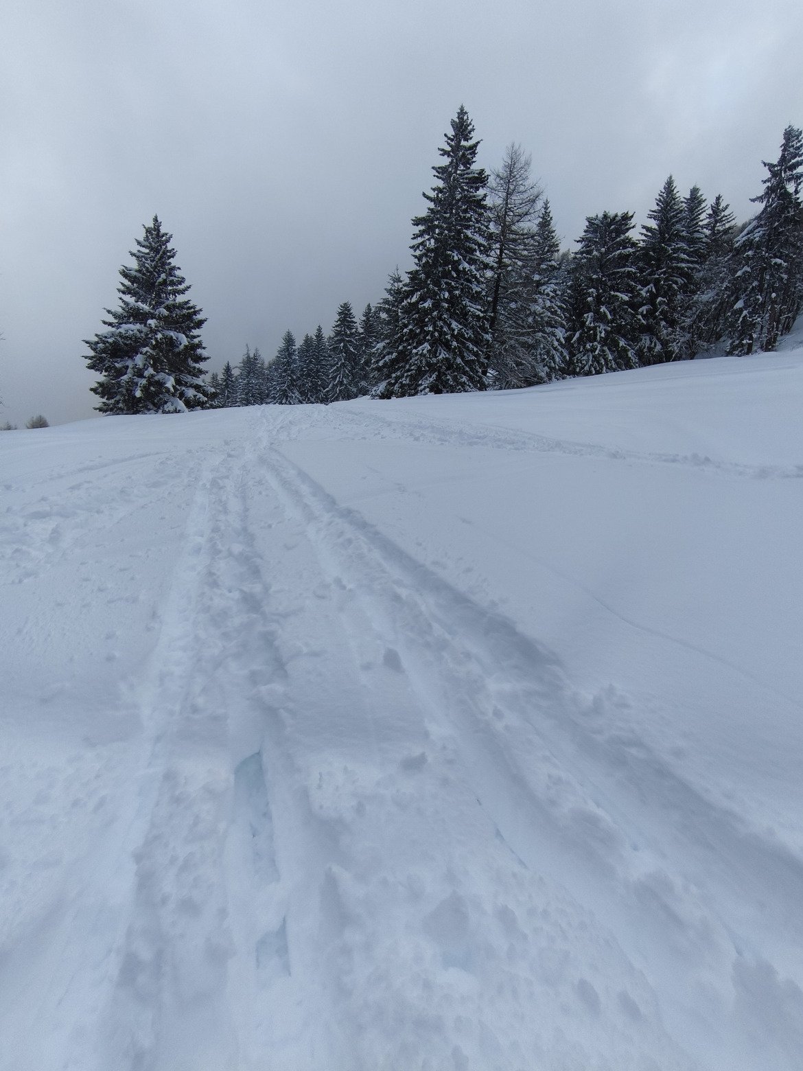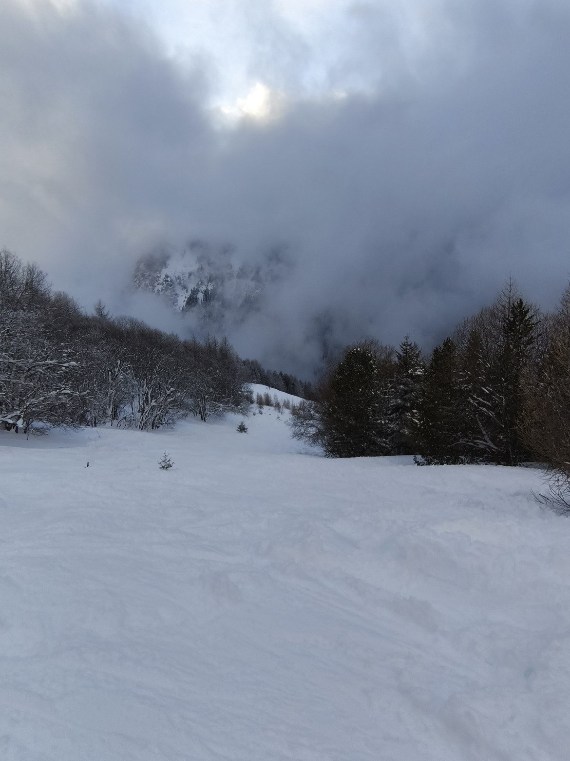 Hors des pistes, la neige nouvelle a tendance à s'alourdir et à se tasser dans cette fourchette d'altitude peu élevée. Il y fait plutôt doux et le couvercle nuageux accentue encore l'humidification du manteau neigeux. On brasse pas mal sous la télécabine d'Arrondaz et c'est très tracé.