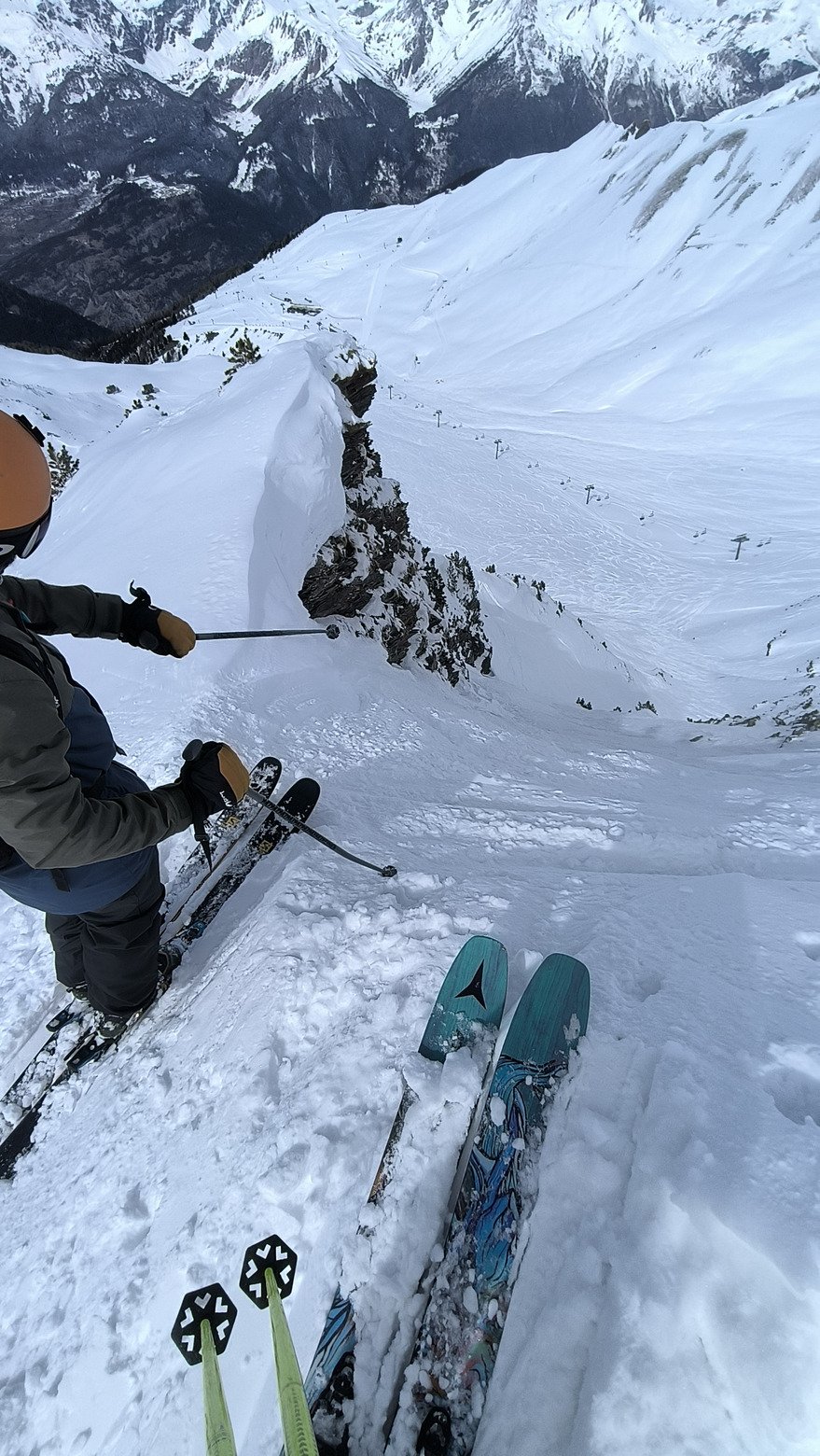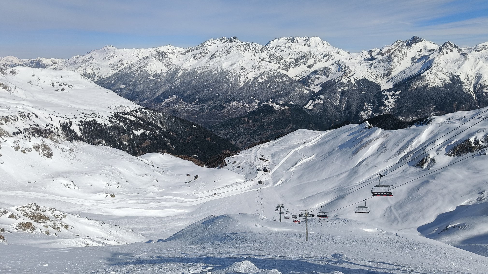 Vers 13h, le ciel commence à se charger et le vent se lève franchement. On arrive quand même à caler encore quelques rotations avant de plier vers 15h30, avec un dernier passage dans les couloirs proches de Punta Bagna : bien froids, super à skier, avec des sorties encore bien poudreuses.