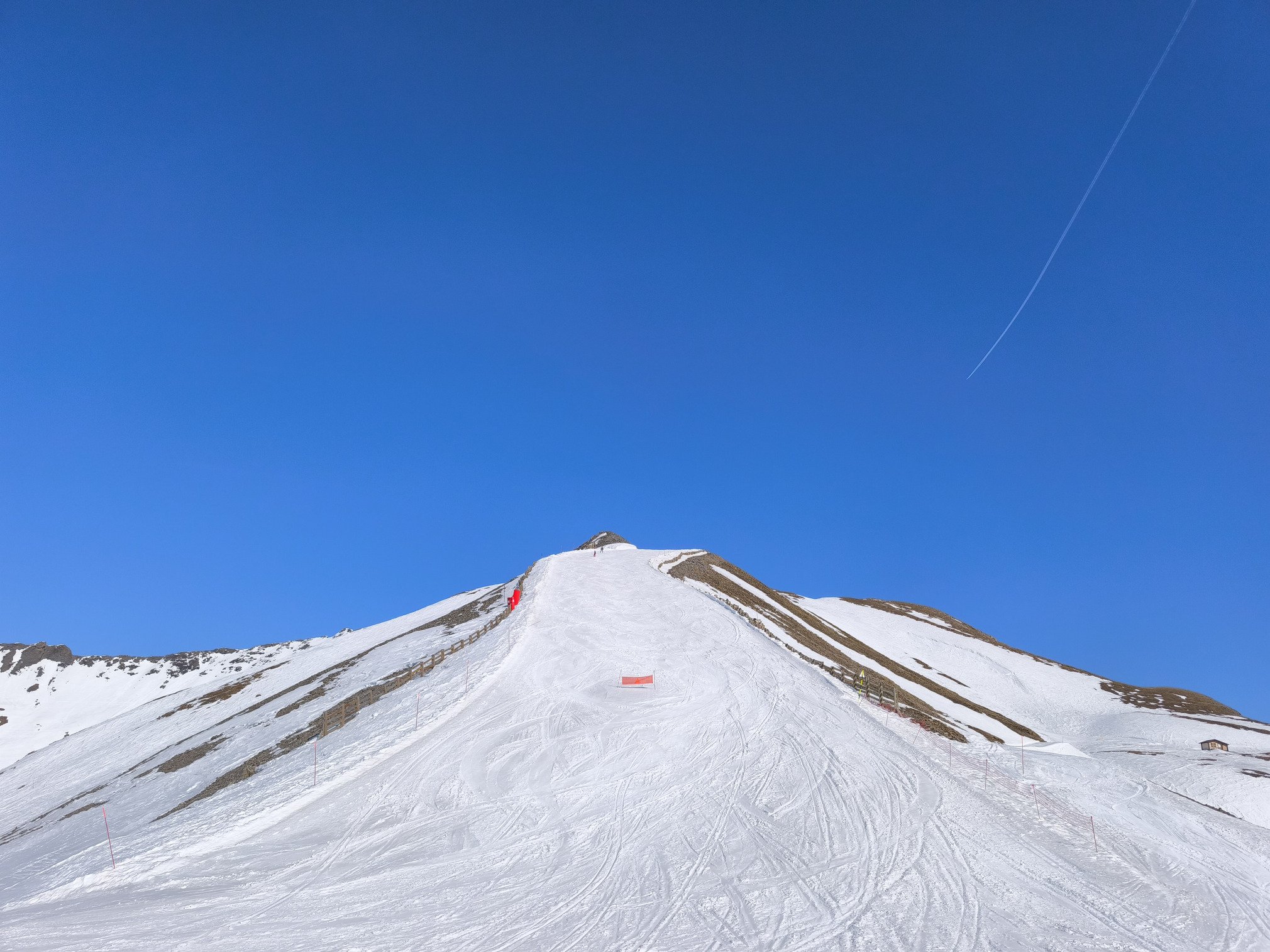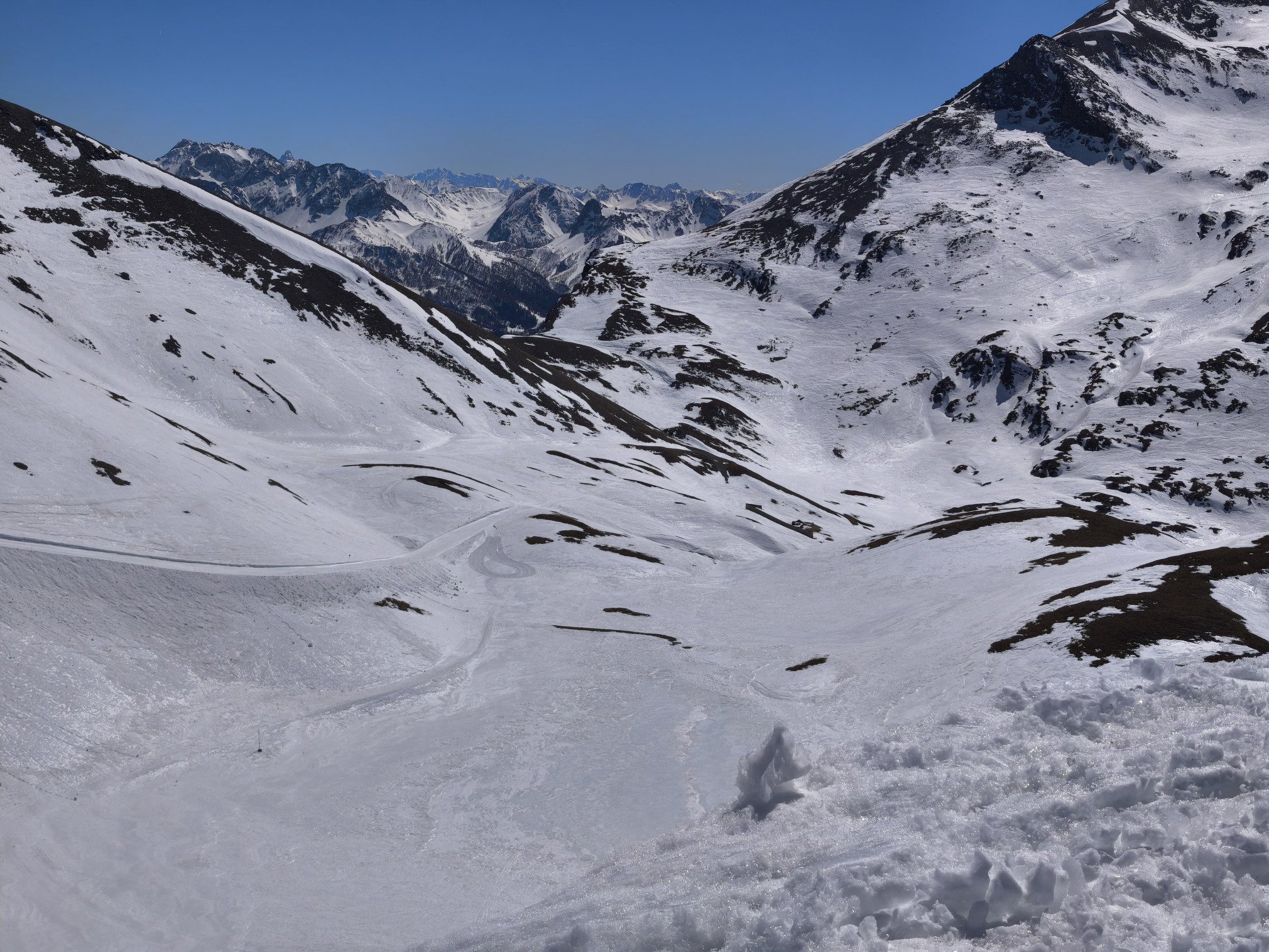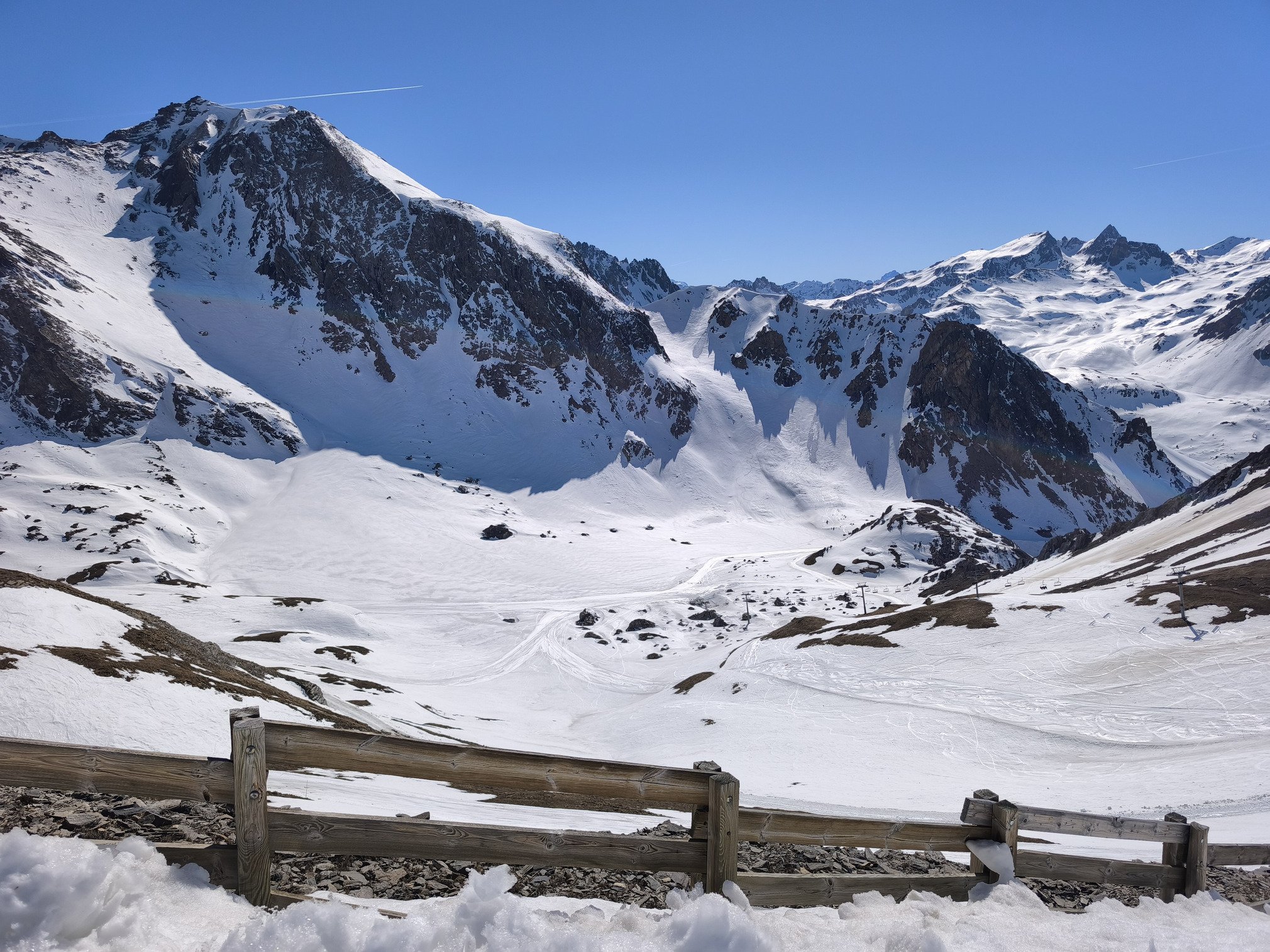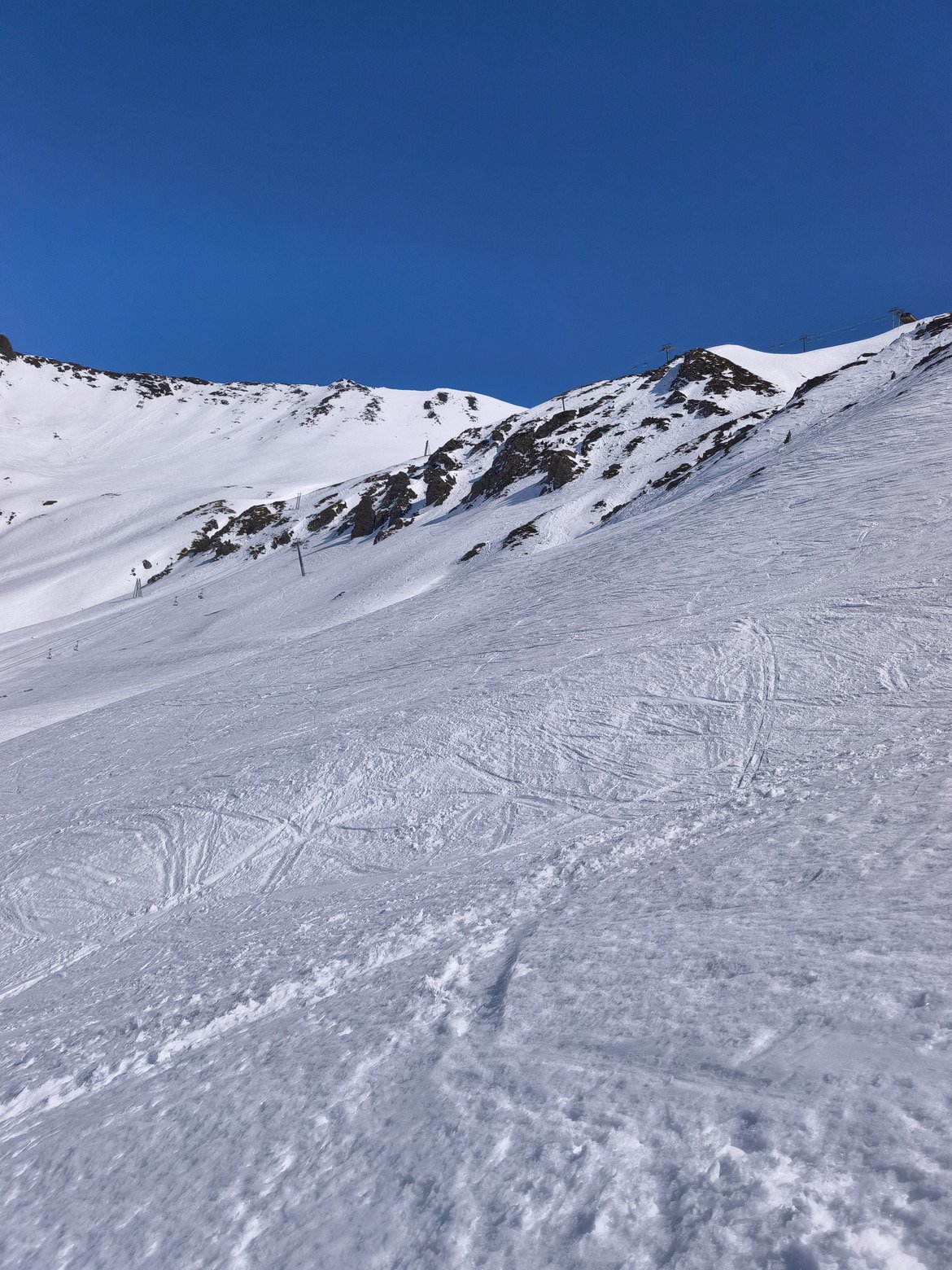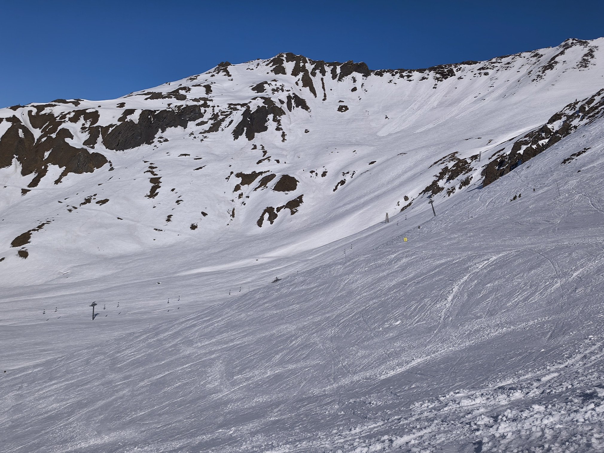 La longue piste bleue du Jeu plus ombragée à partir du Lavoir a pu rester bien glissante jusqu'en fin de matinée (piste fermée l'après-midi). Les deux pistes noires du haut du domaine (Punta Bagna et Corniche) ont été fermées ainsi que la Modanaise qui a souffert de la chaleur. Il faut dire que la fonte est bien engagée sur les pistes exposées de l'Envers Col. Ailleurs on conserve encore une belle épaisseur à deux jours de la fermeture. En fin d'après-midi le retour station se fait sans problème par les Souches en mode soupe qui reste sympa à skier ou par les Bovenières puis Charmasson.