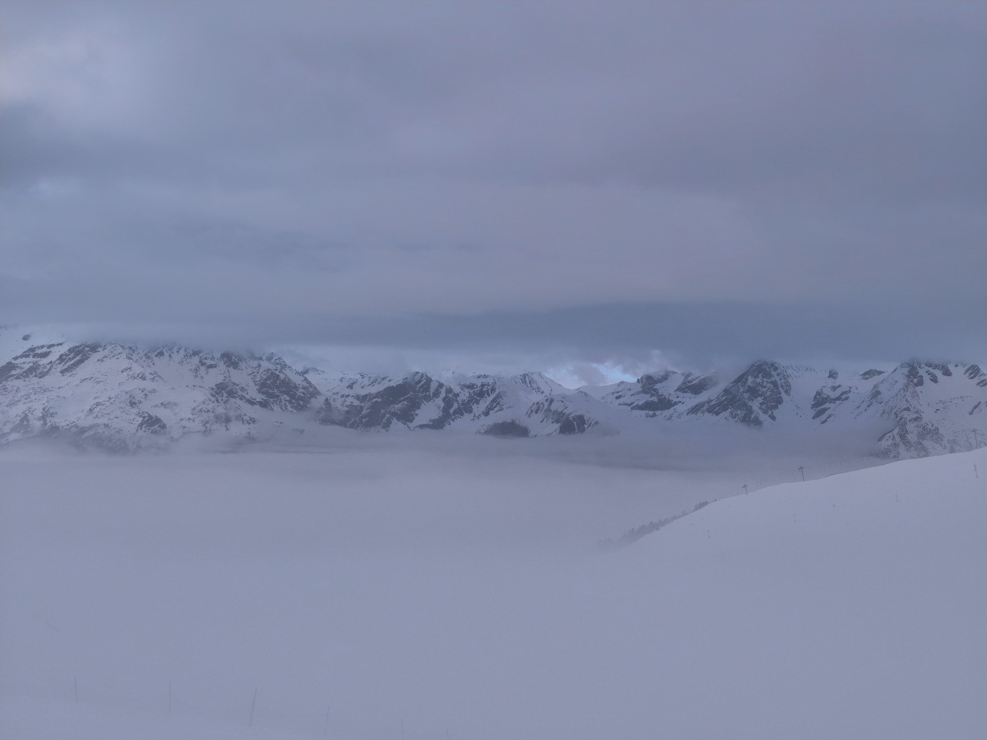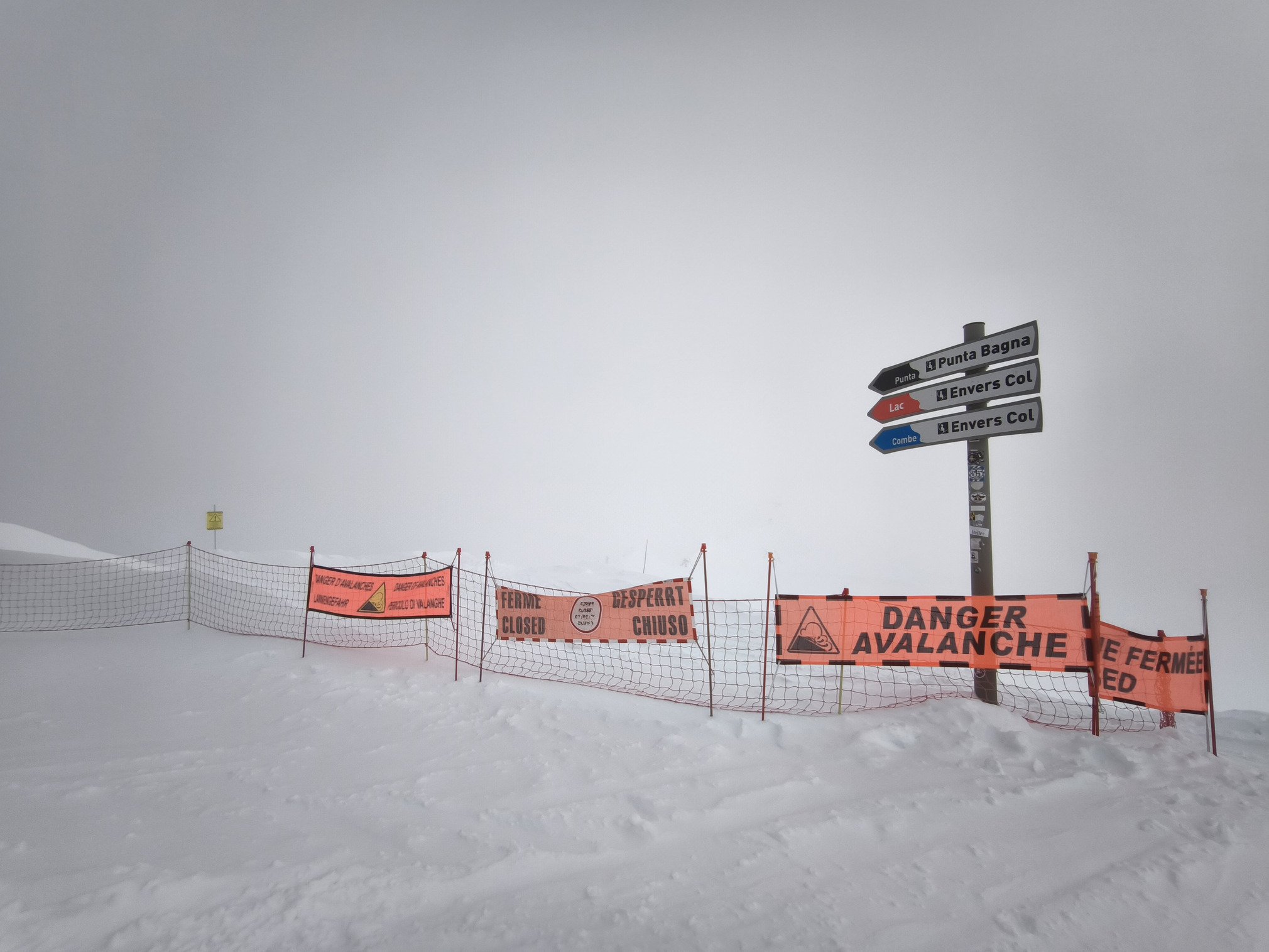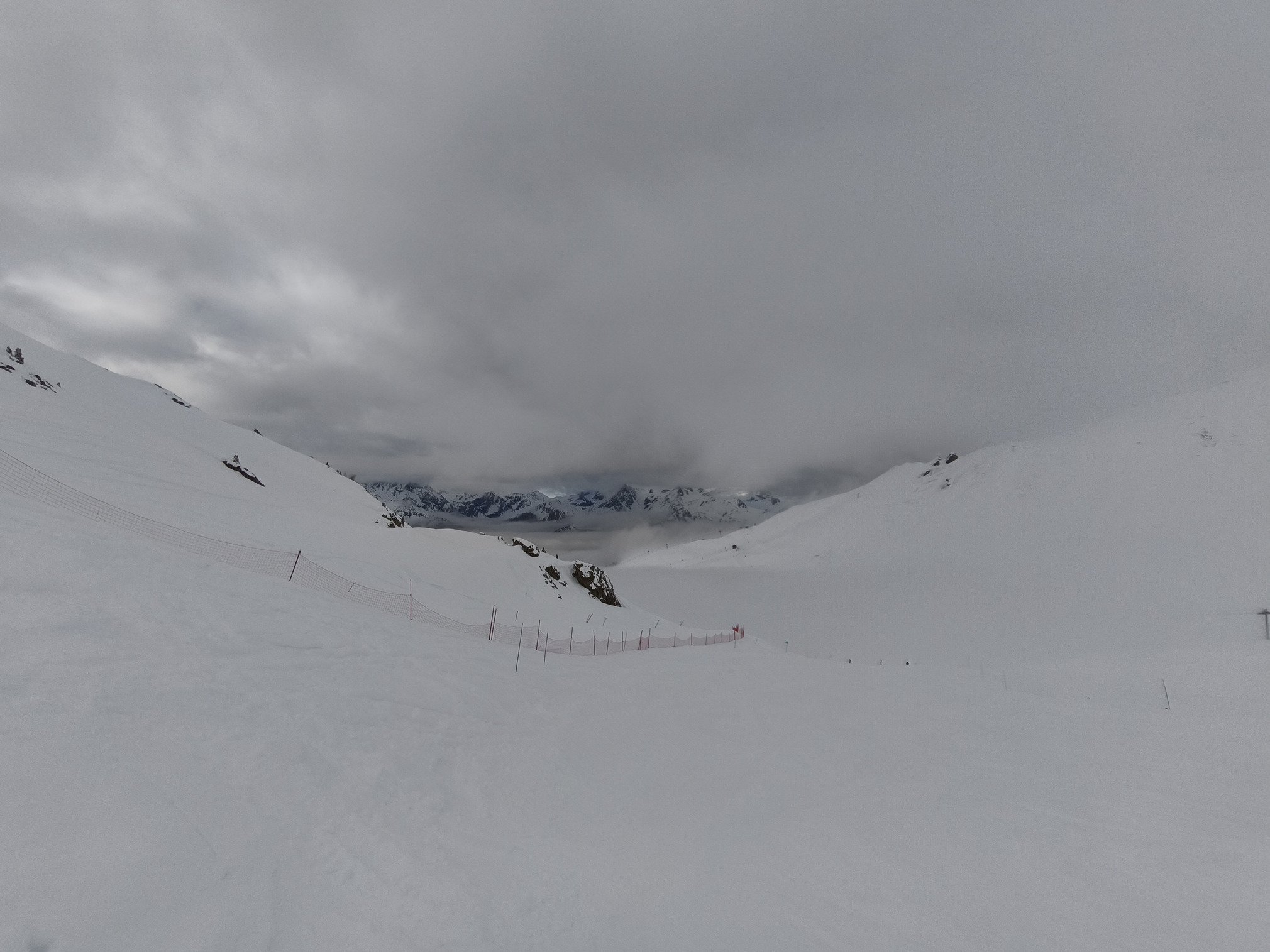 En arrivant au sommet de Punta Bagna les filets annoncent la couleur : risque avalanche important et l'accès aux pistes du Lac, de la Combe et de Punta Bagna est fermé. Idem pour le retour station via la longue piste du Jeu.
