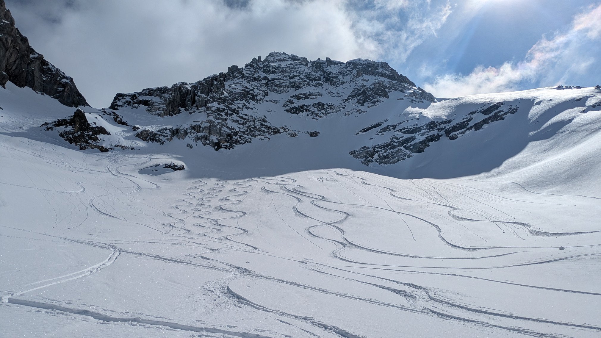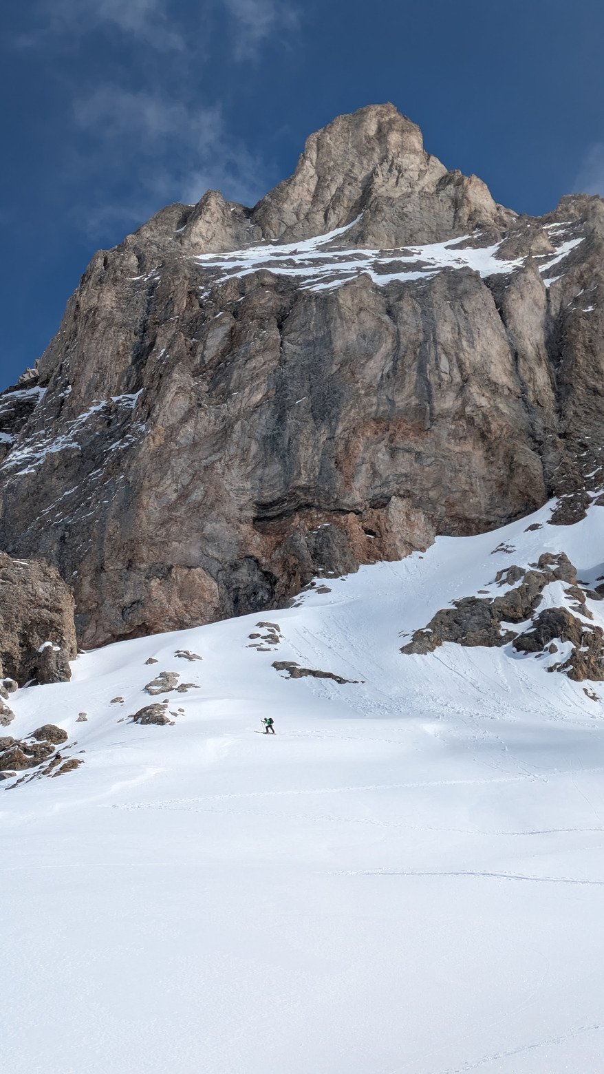 Sortie des pistes de Valfrejus en peaux pour aller chercher les expositions encore fraîches et pas cartonnées vers la Gran Bagna : très bonne pioche, mais il suffit de quelques degrés d'orientation Ouest pour retrouver la croûte ! La montée raide se mérite, mais en Nord c'est monstre bon, et de retour sur le domaine dans l'après-midi la majorité a décaillé comme il faut pour se faire plaisir en mode printemps ! Pas grand monde sur le domaine, une journée comme on les aime dans le coin !