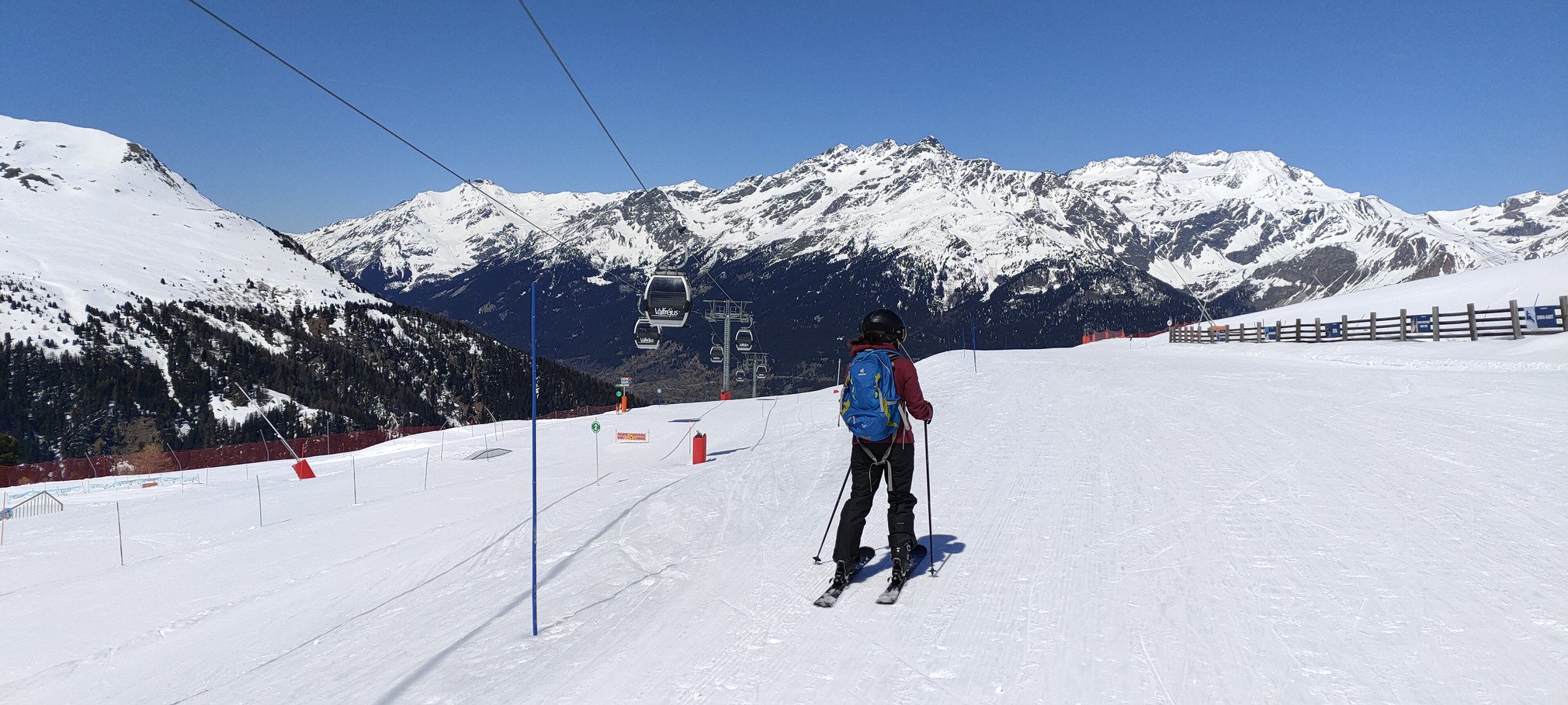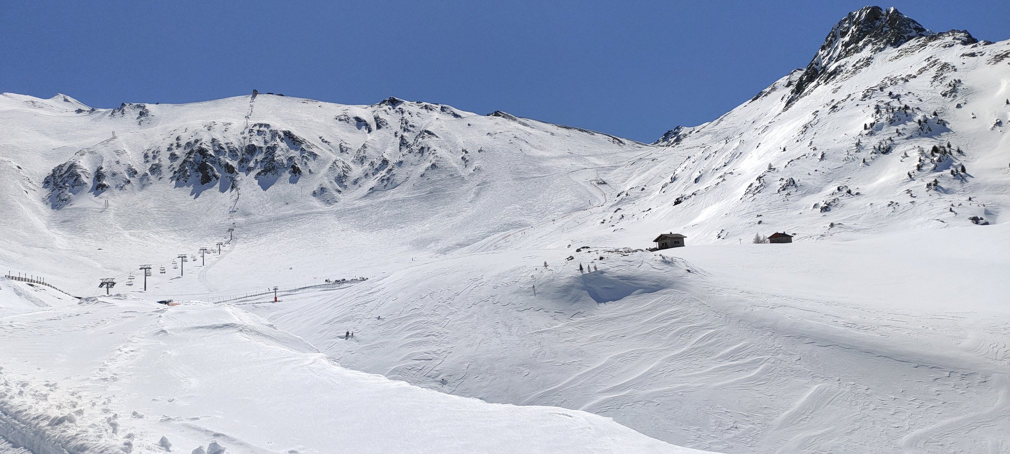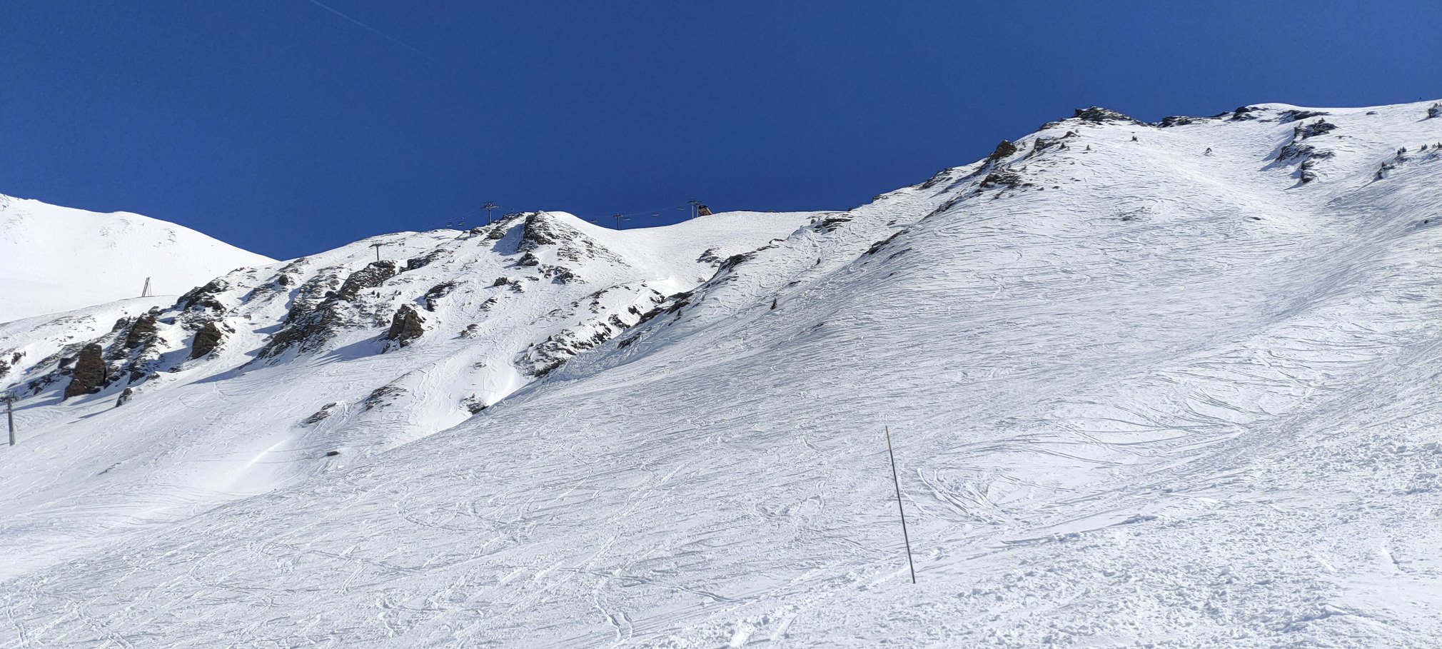 J'ai aussi poncé à peu près toute la face de Punta Bagna en hors piste. Encore très sympa à skier globalement, en particulier sur le côté droit en descendant (soit entre la ligne du télésiège et la piste noire Punta Bagna), avec de la neige douce et plutôt meuble, et même quelques (petites) poches de vieille poudre. Un peu moins bon côté gauche en revanche, car le vent a davantage fait son oeuvre. C'est très cartonné, lisse en surface mais qui tape. Quelques bons virages, mais il faut bien les chercher.