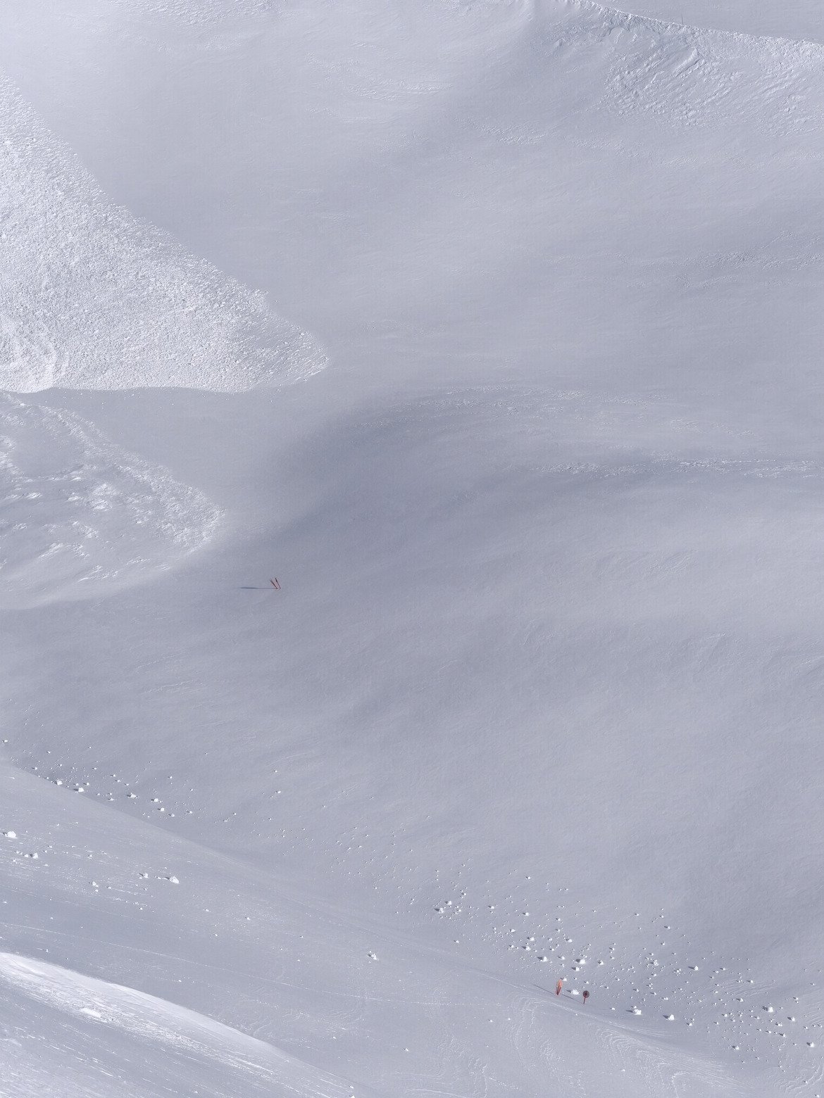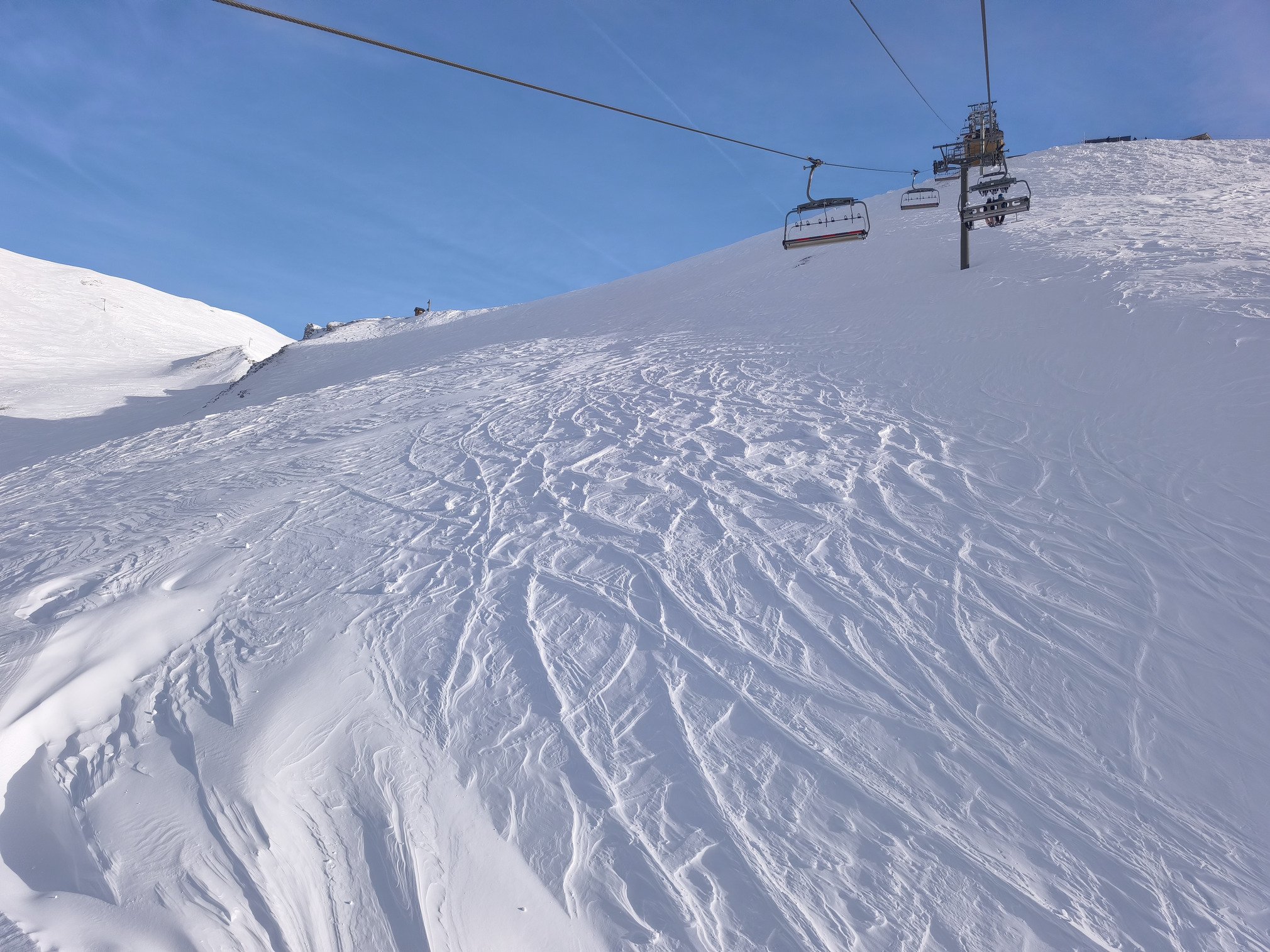 Impressionnante aussi la forte action du vent qui a remodelé le paysage. Les crêtes exposées sont dénudées. On est loin du décor plâtré blanc uniforme de la semaine dernière. Sous le télésiège de Punta le manteau neigeux a été hyper soufflé : "Regarde ya des vagues !" comme disent les enfants !