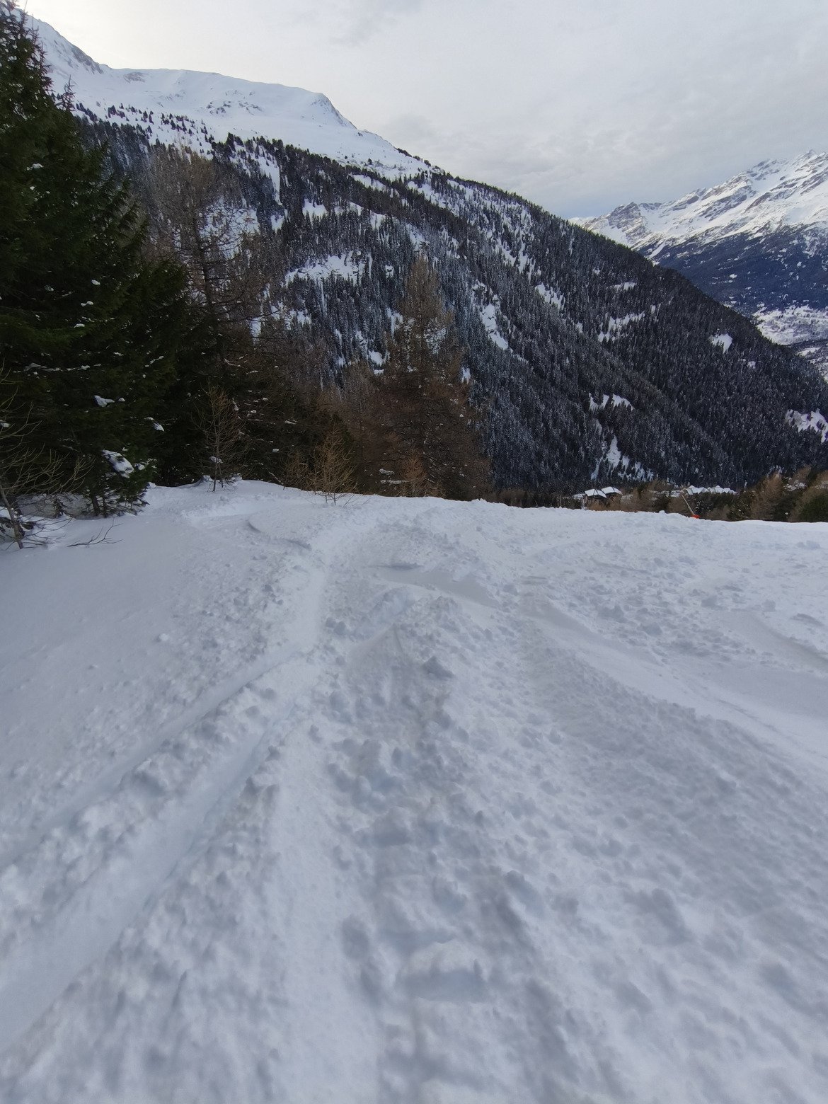 C'est une ambiance quasi printanière cet après-midi avec une grande douceur qui a beaucoup ramolli la neige (+2 degrés vers 1800 mètres à 14h). Sur piste ça devient un peu collant et croûté au fil des heures. Le petit hors piste à proximité du Col s'alourdit à vue d'œil avec la neige fraîche qui s'humidifie fortement à toutes les altitudes. Pourvu que l'iso 0 ne remonte pas trop... (risque avalanche 5/5 aujourd'hui).